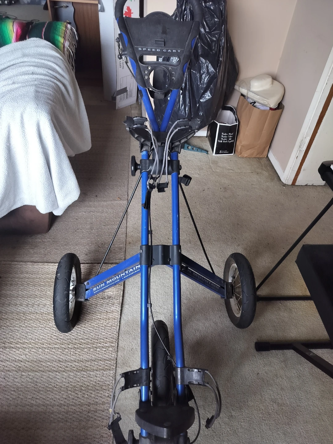 This is a blue Sun Mountain Speed Cart golf push cart. It's a three-wheeled cart that folds for storage. Perfect for carrying your golf bag around the course!