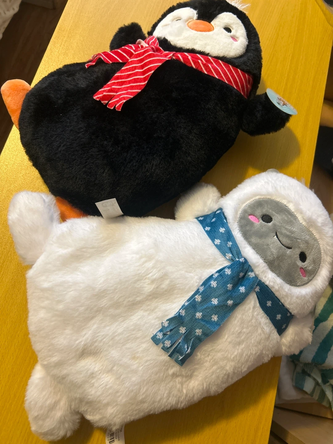 Two cute plush hot water bottle covers, one a penguin and one a white seal. They're made of soft, fluffy material and come with scarves. A fun way to stay warm!