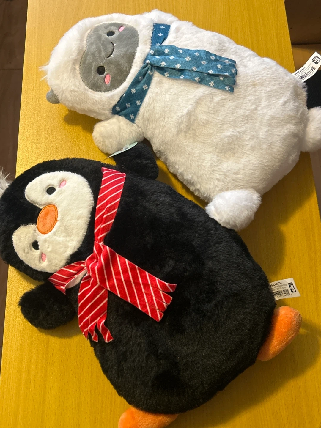 Two cute plush hot water bottle covers, one a penguin and one a white seal. They're made of soft, fluffy material and come with scarves. A fun way to stay warm!