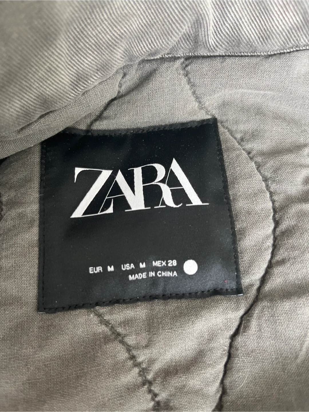 This is a grey Zara quilted bomber jacket. It's a size medium with a zip-up front and two pockets. The jacket is made of cotton and polyester. A great layering piece for cooler weather!