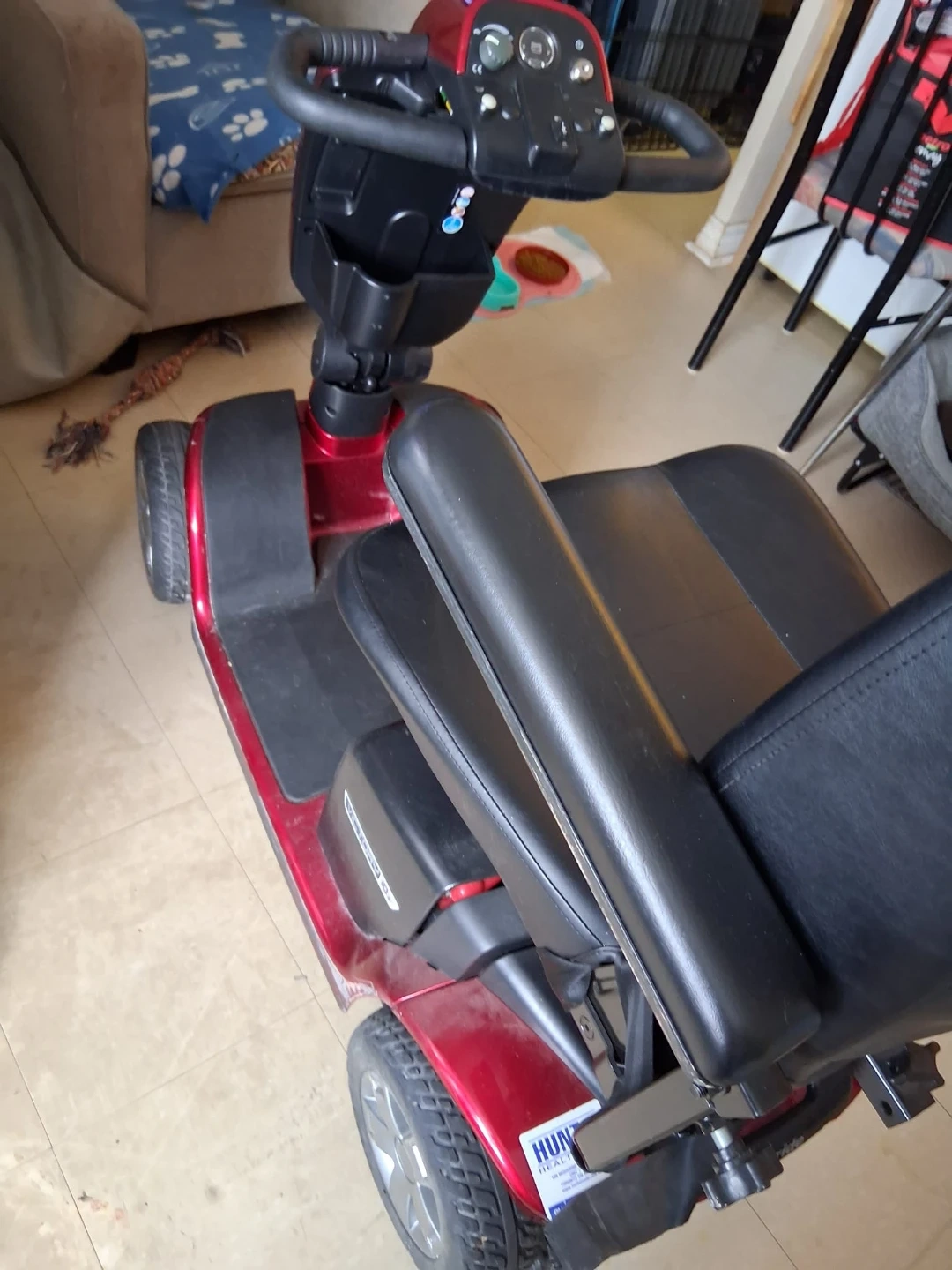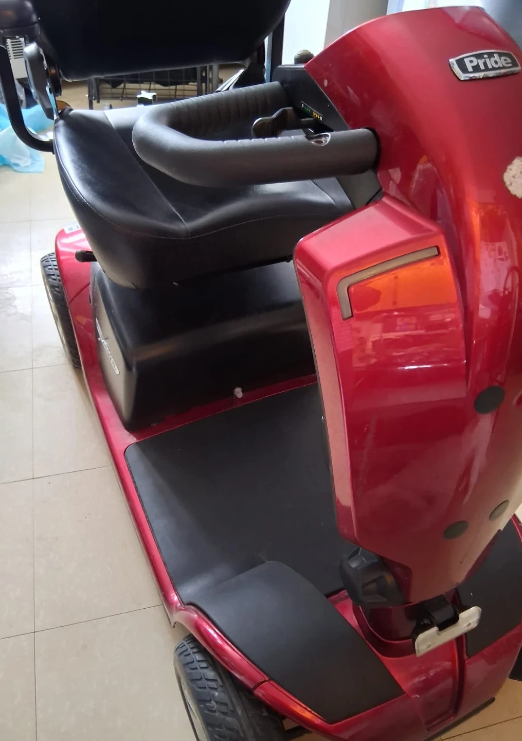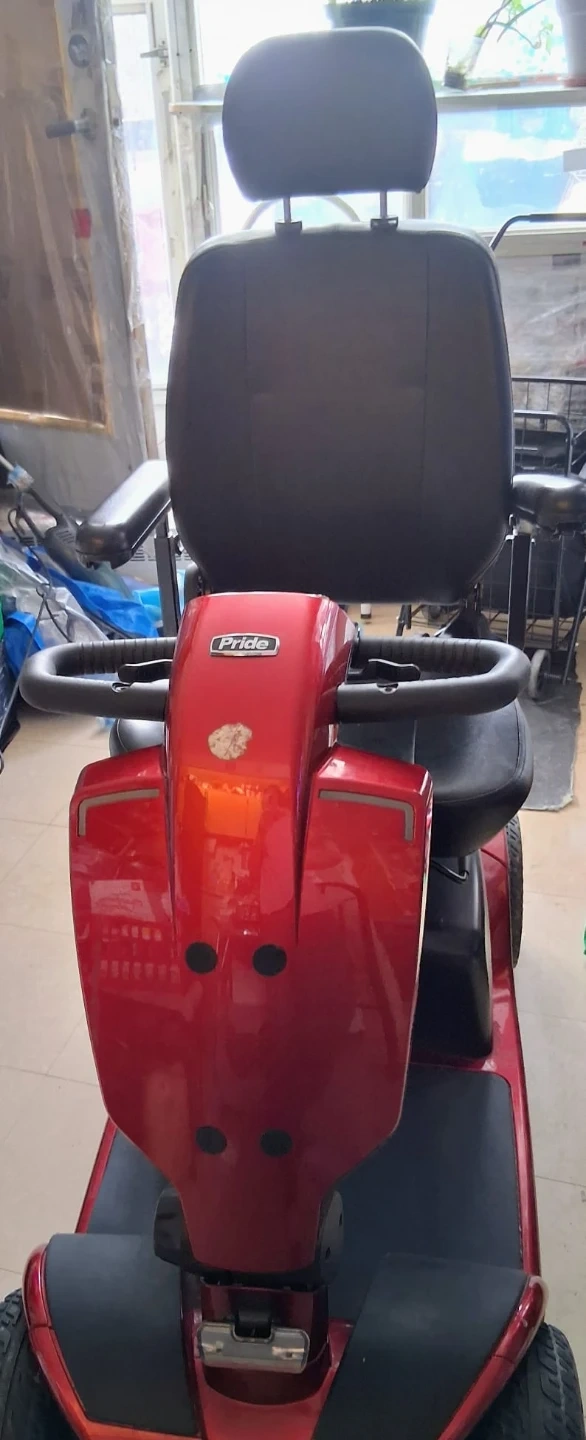 Used red Pride mobility scooter with black leather seat. It's in good condition and ready for a new owner. This scooter provides reliable transportation.
