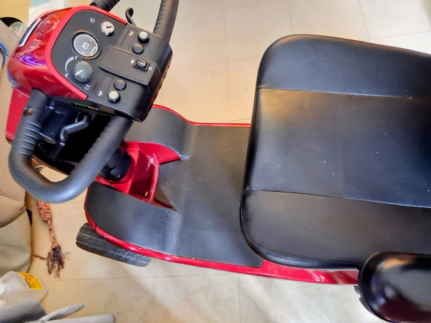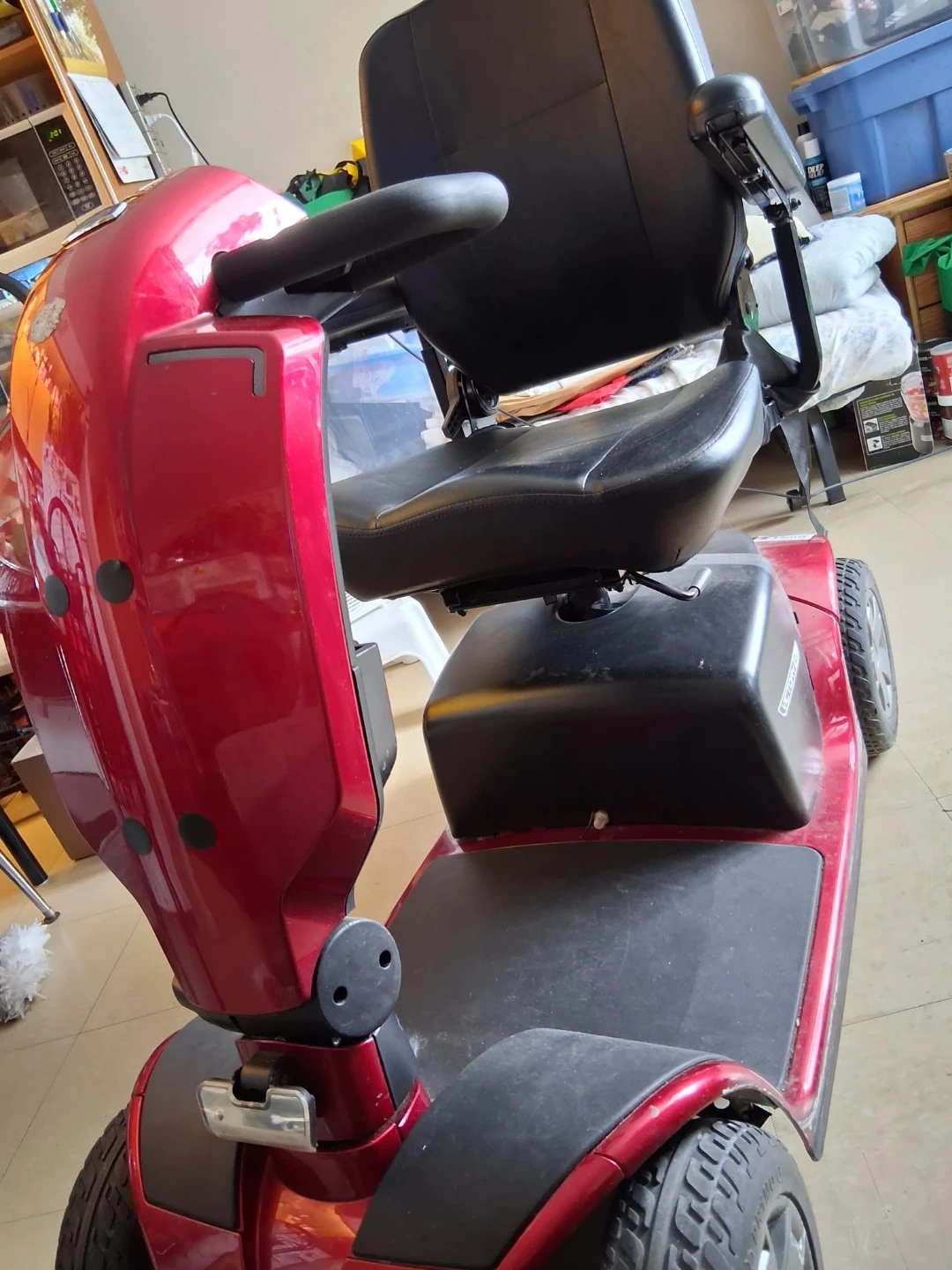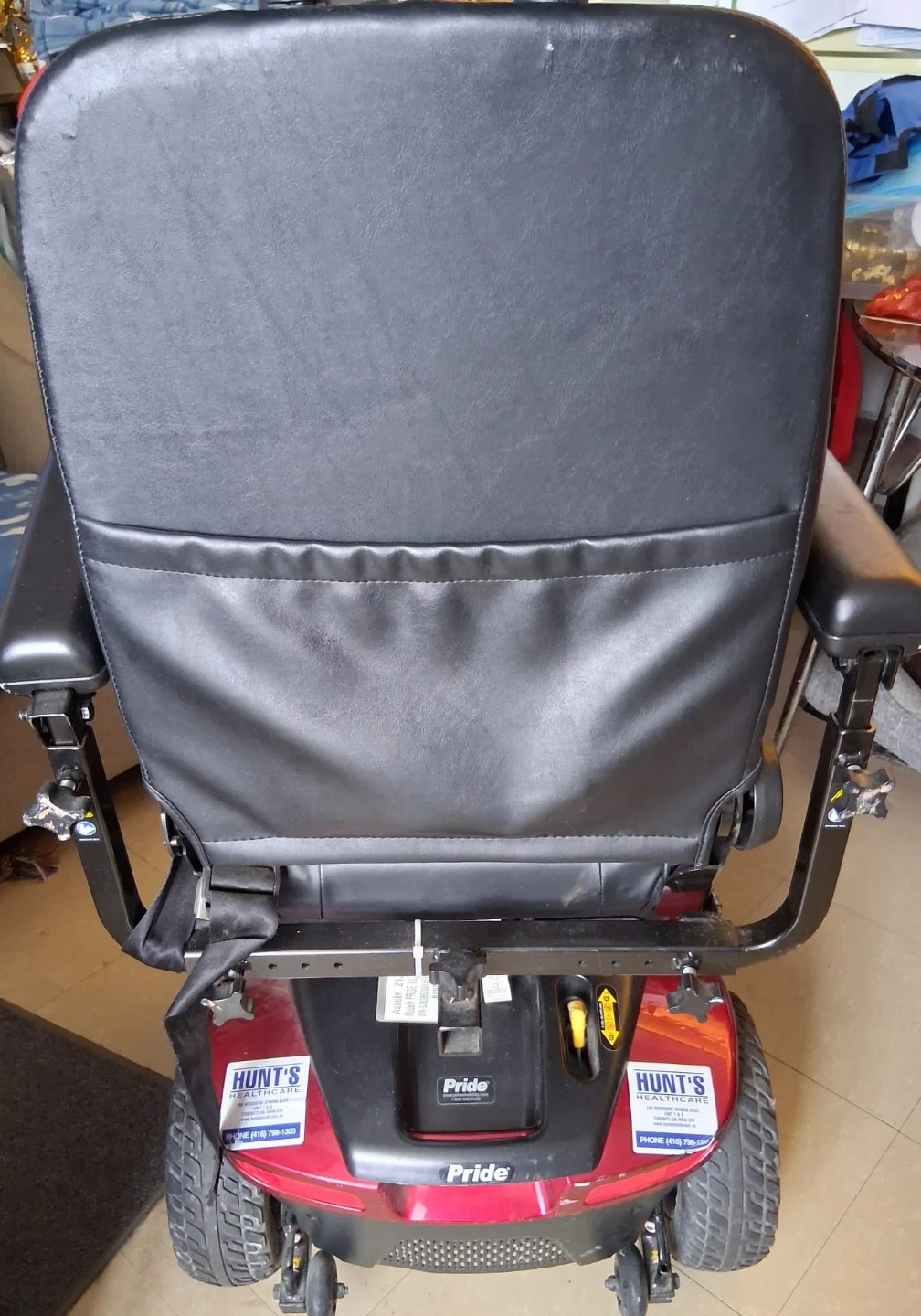 Used red Pride mobility scooter with black leather seat. It's in good condition and ready for a new owner. This scooter provides reliable transportation.