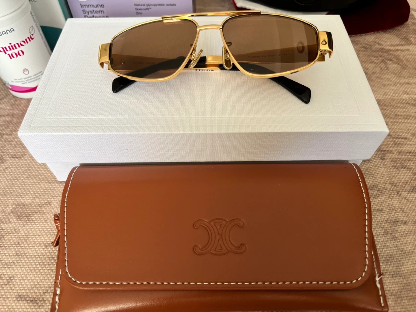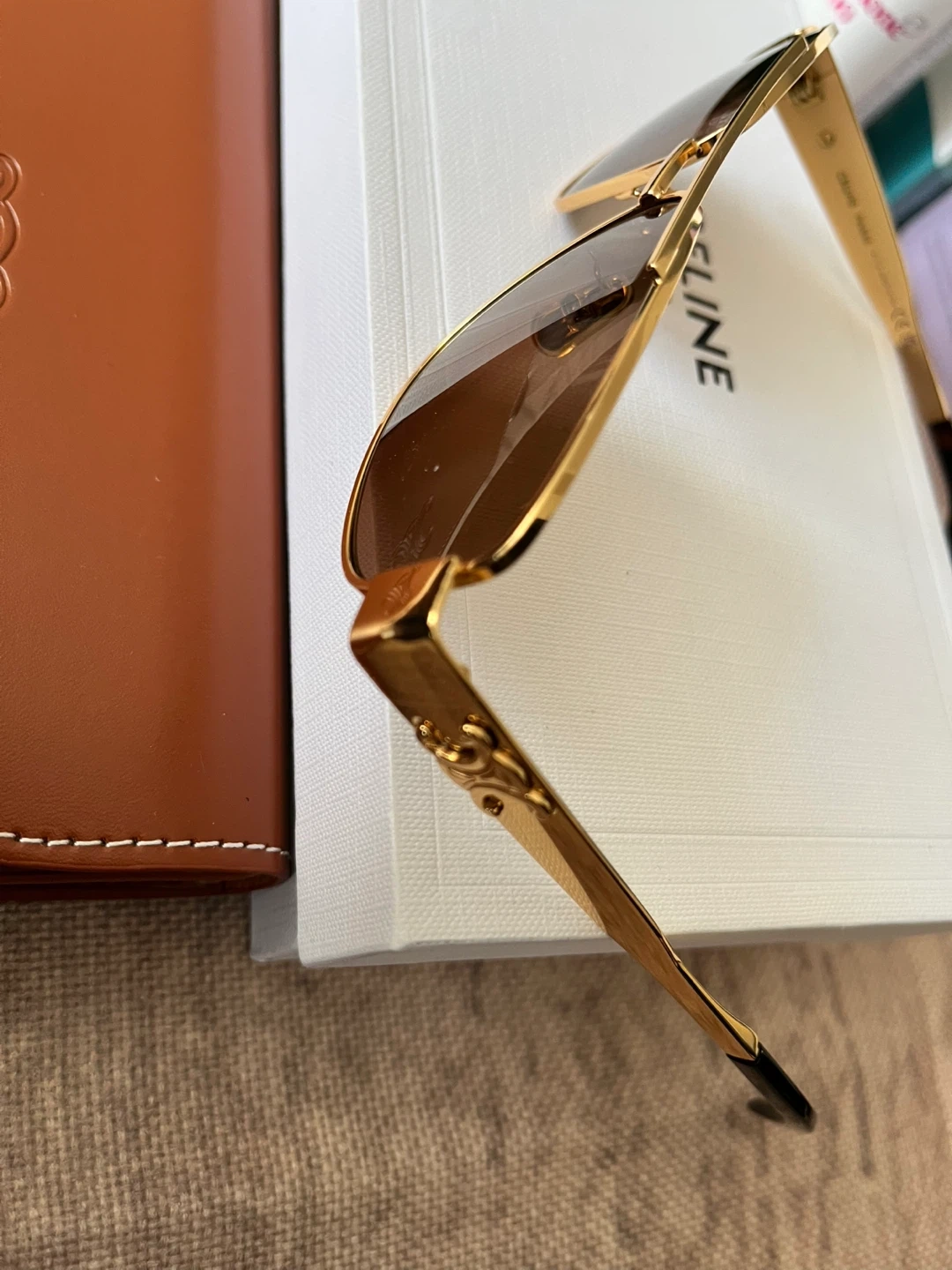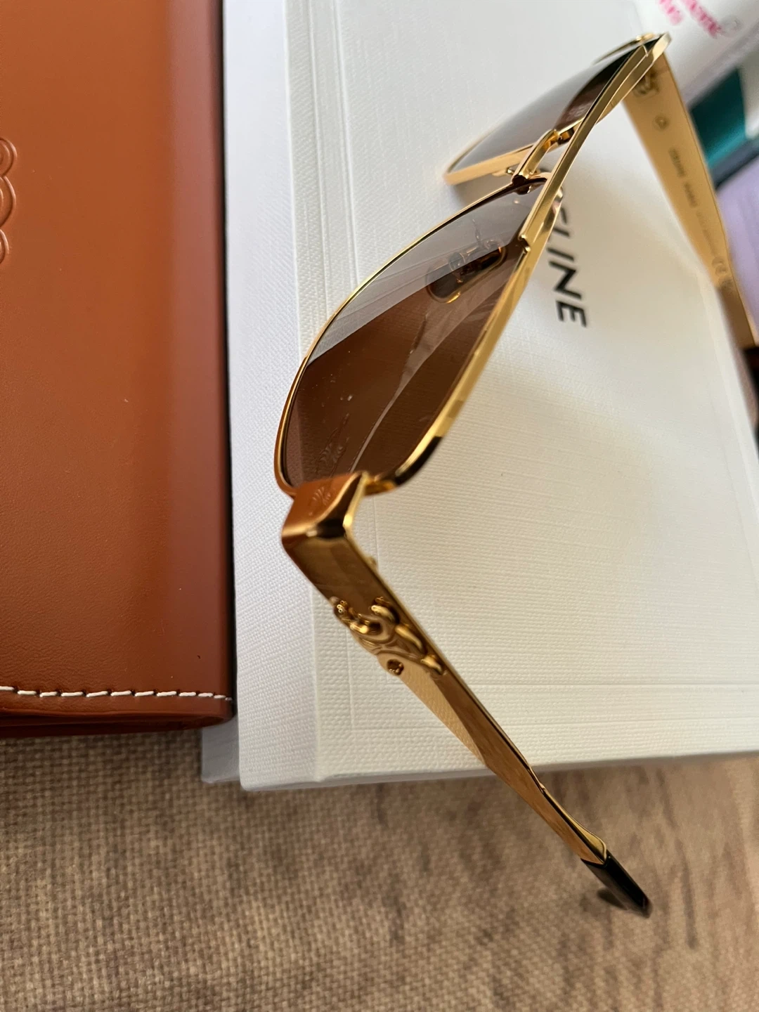 Celine aviator sunglasses with gold-toned metal frames. Brown lenses offer classic style and protection. Includes original case and box.