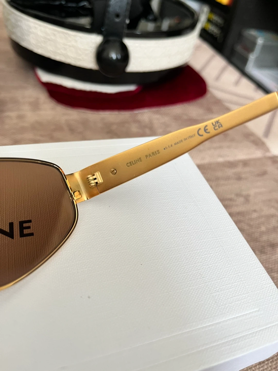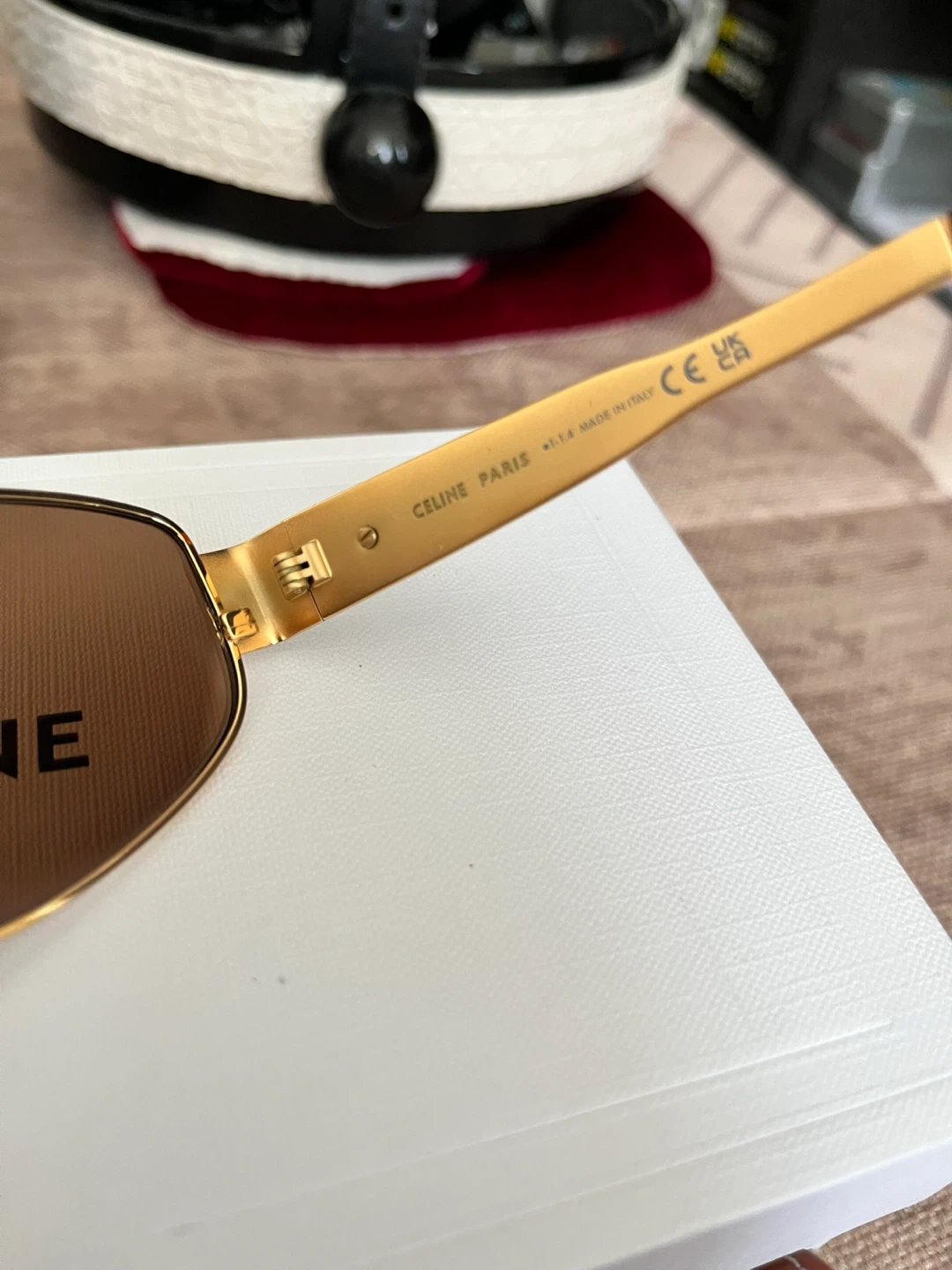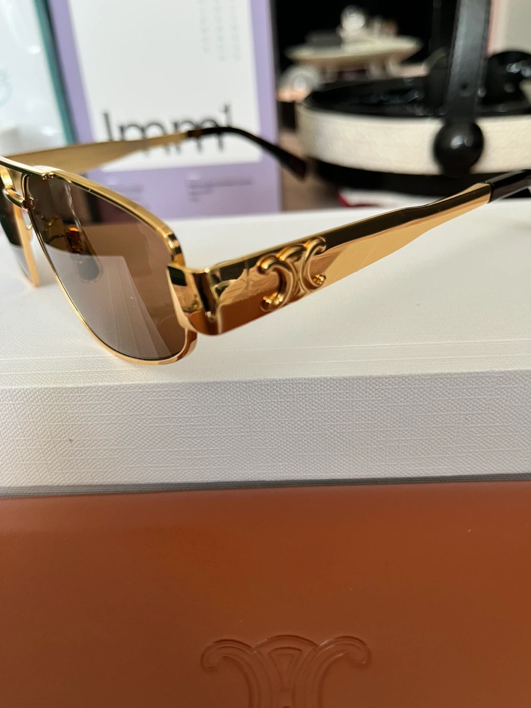 Celine aviator sunglasses with gold-toned metal frames. Brown lenses offer classic style and protection. Includes original case and box.