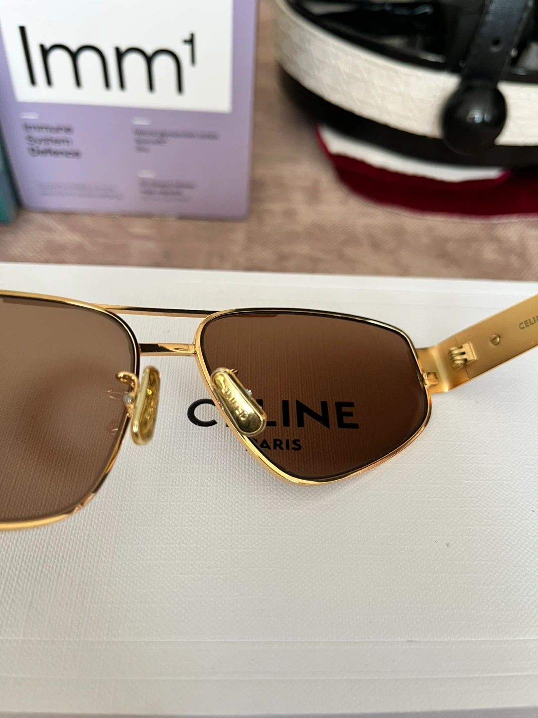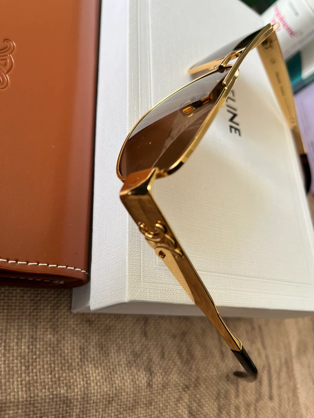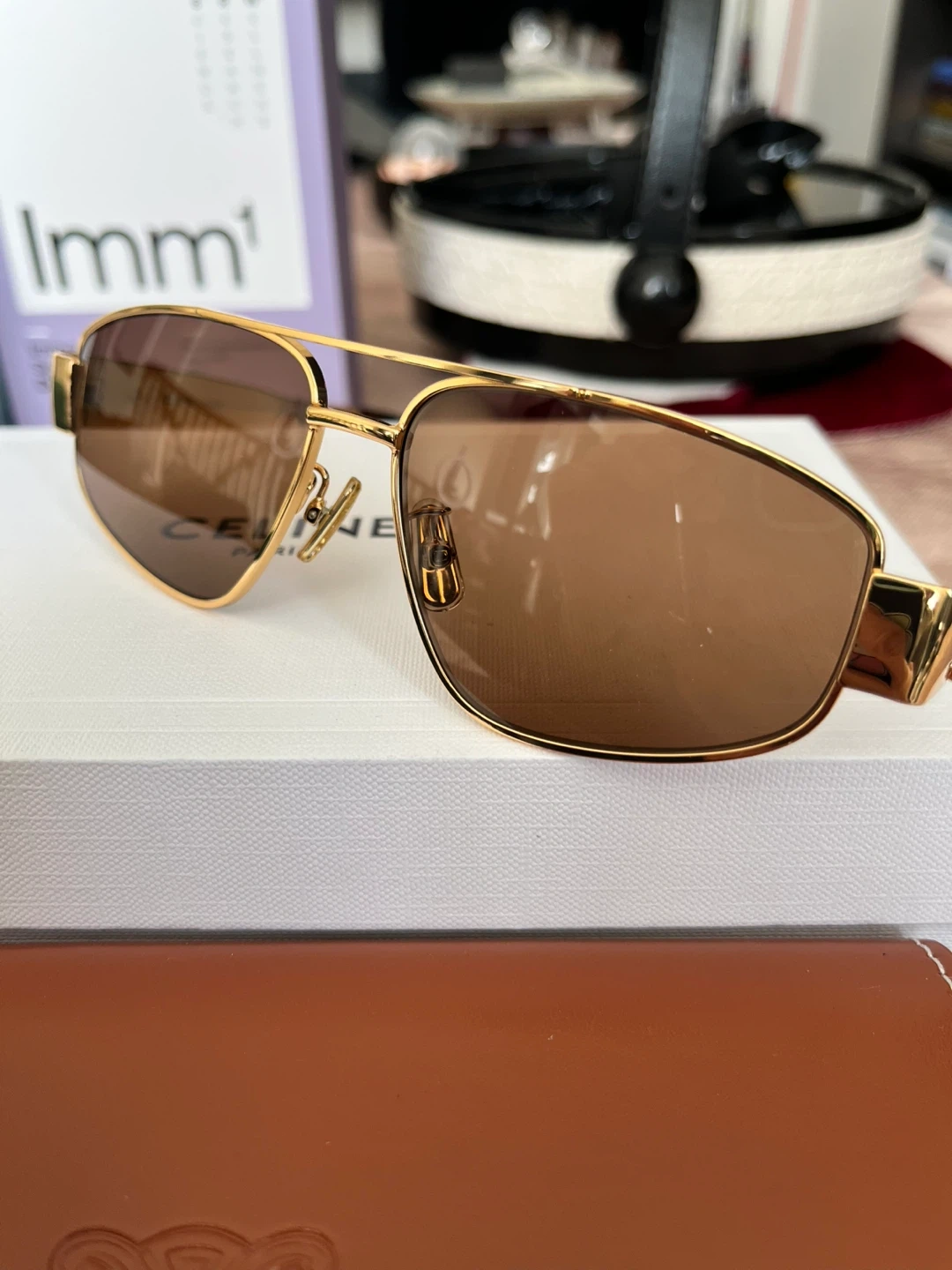 Celine aviator sunglasses with gold-toned metal frames. Brown lenses offer classic style and protection. Includes original case and box.