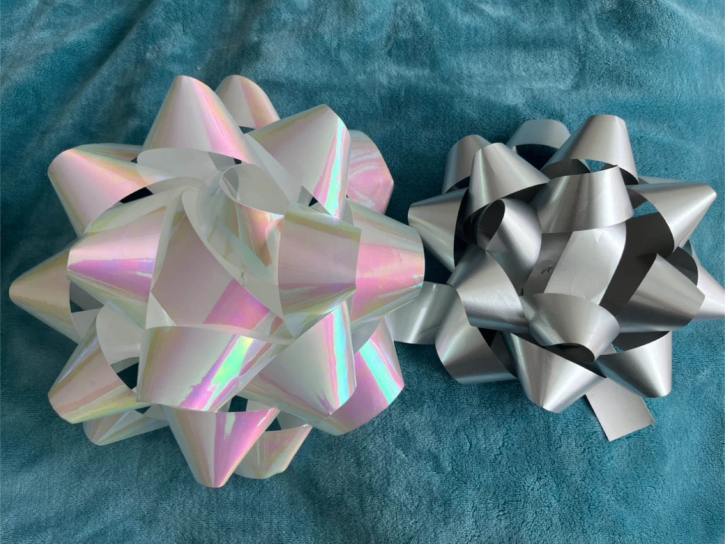 Two large gift bows included. One has an iridescent finish that shows rainbow colours. The other is a metallic silver colour. These bows are perfect for adding a festive touch to presents!