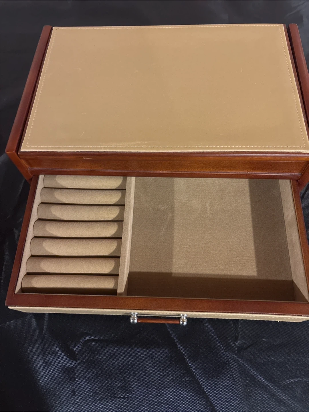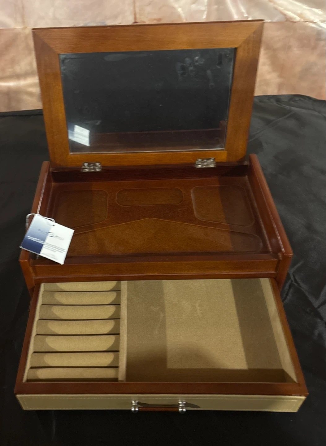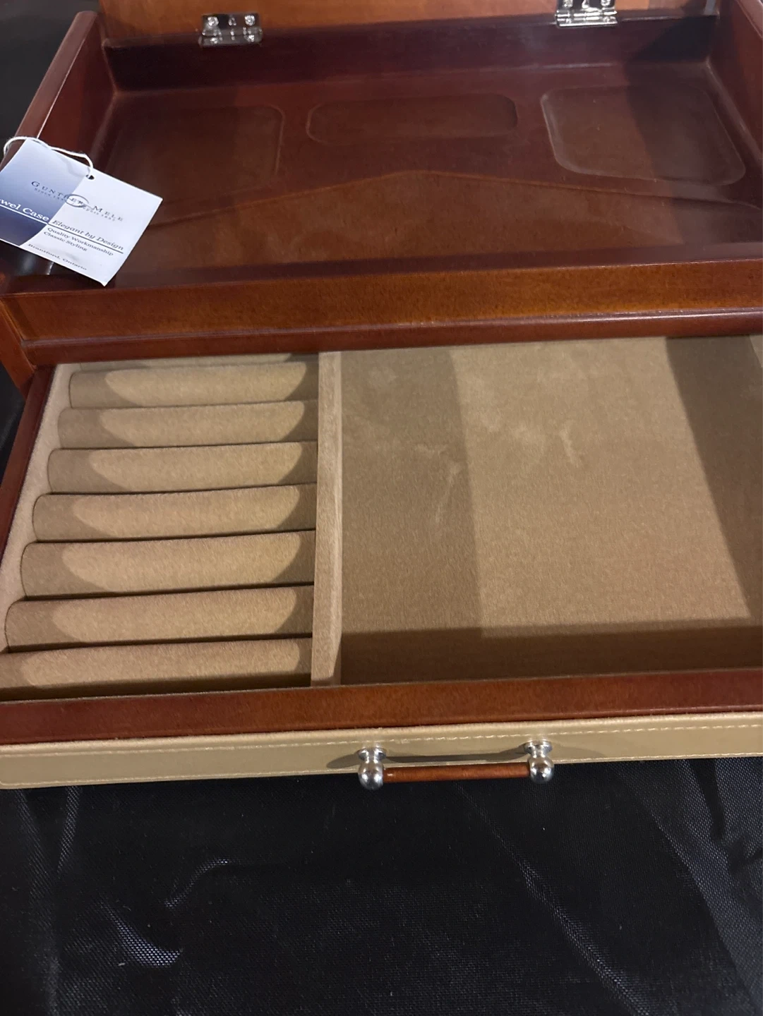 This Gunter & Mele jewel case is designed for organizing your valuables. It features a mirrored lid and a drawer with ring rolls and compartments. Wood and faux leather construction.