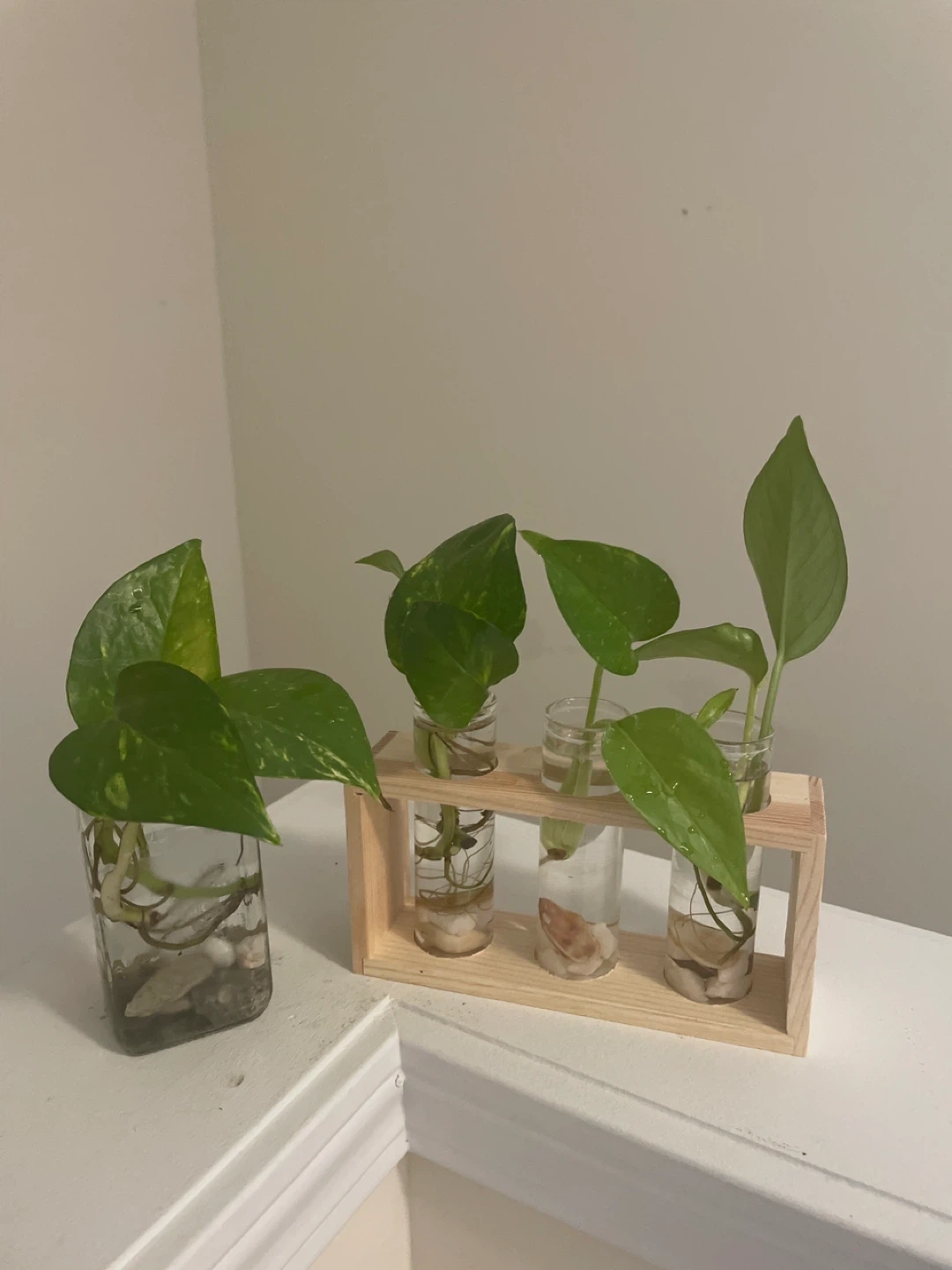 A set of healthy pothos plant cuttings rooted in glass vials. They're displayed in a simple wooden stand, perfect for starting new plants. Each vial includes small stones for support. This is a great way to add some greenery to your space!