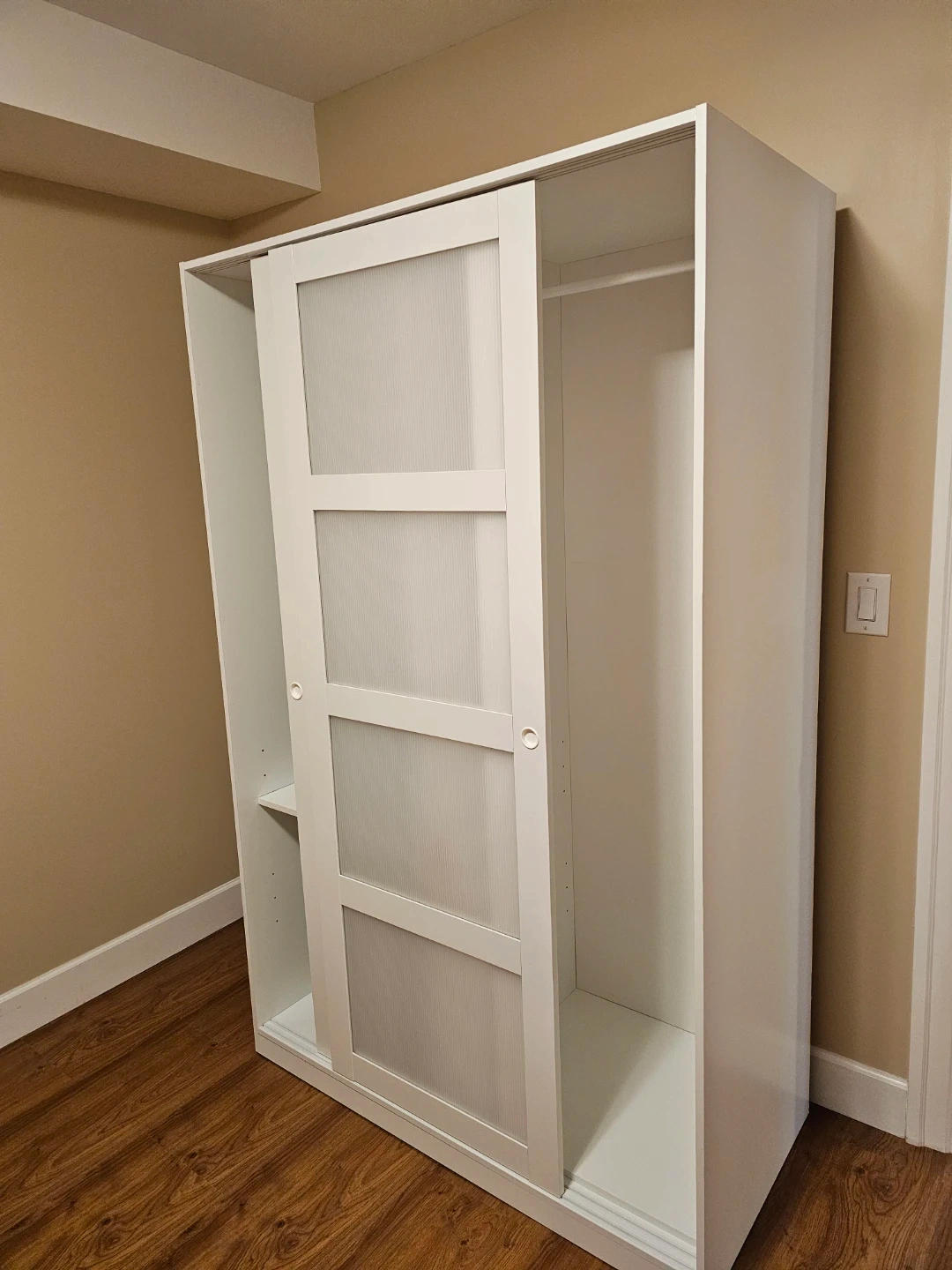 White wardrobe with sliding doors and internal shelving. Features a hanging rod and two shelves. Great for storing clothes and accessories.