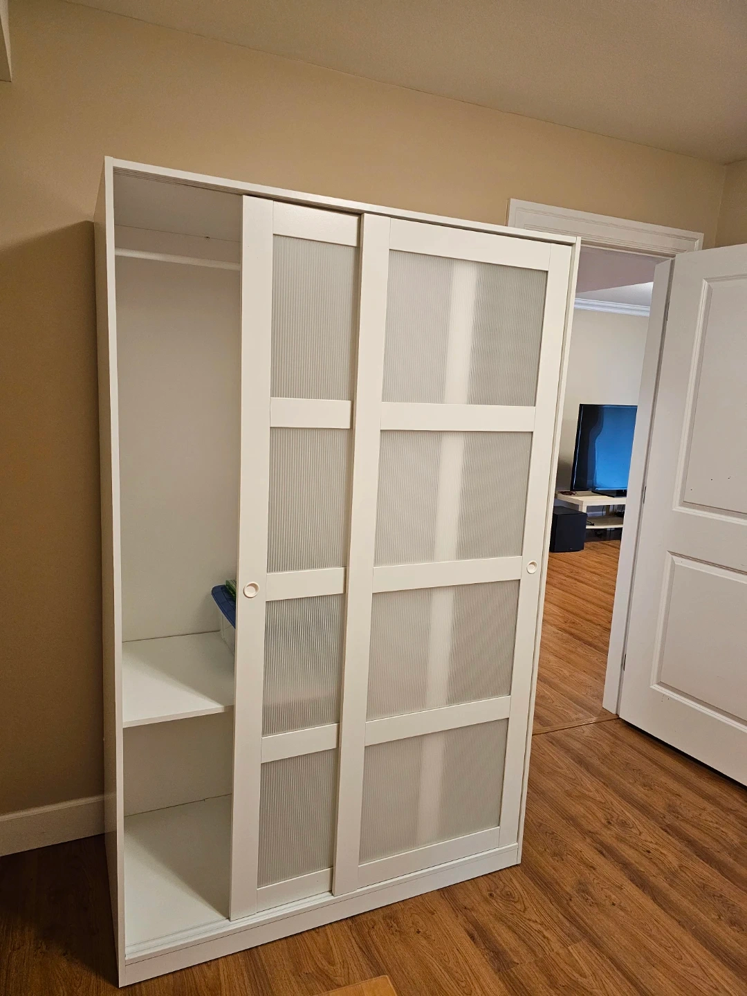 White wardrobe with sliding doors and internal shelving. Features a hanging rod and two shelves. Great for storing clothes and accessories.