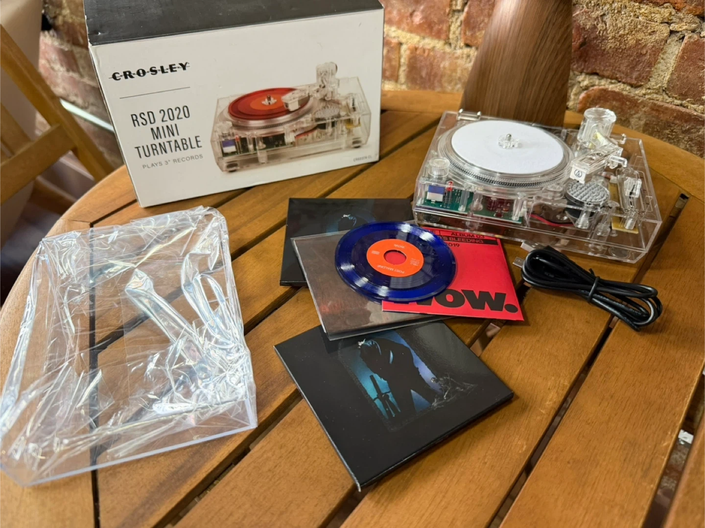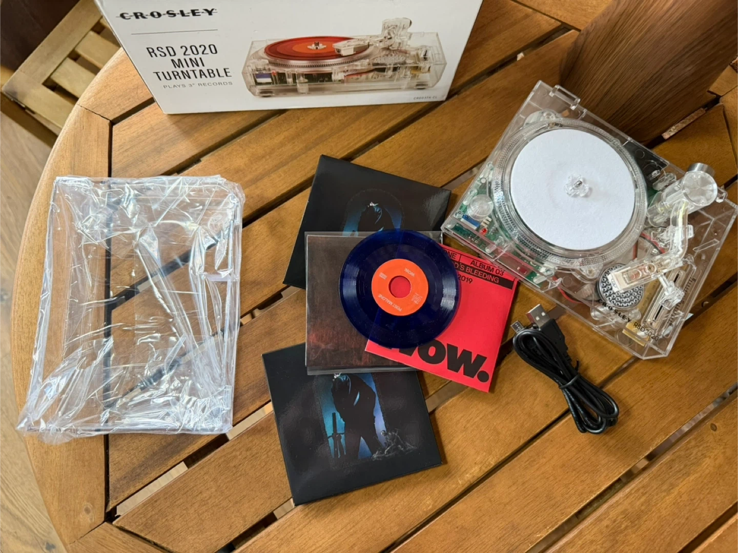 The NEW Crosley RSD 2020 3" Clear Mini Turntable is a LIMITED EDITION model CR6037A. It's a transparent, portable record player that plays 3" records. stylish and compact vinyl player perfect for music enthusiasts. With features like a headphone jack and belt drive, this turntable offers a convenient listening experience. This special edition bundle includes 2 vinyl records, making it a complete package for any music collector or lover. The clear color and sleek design add a modern touch to any home audio setup. Never used, just opened once to test