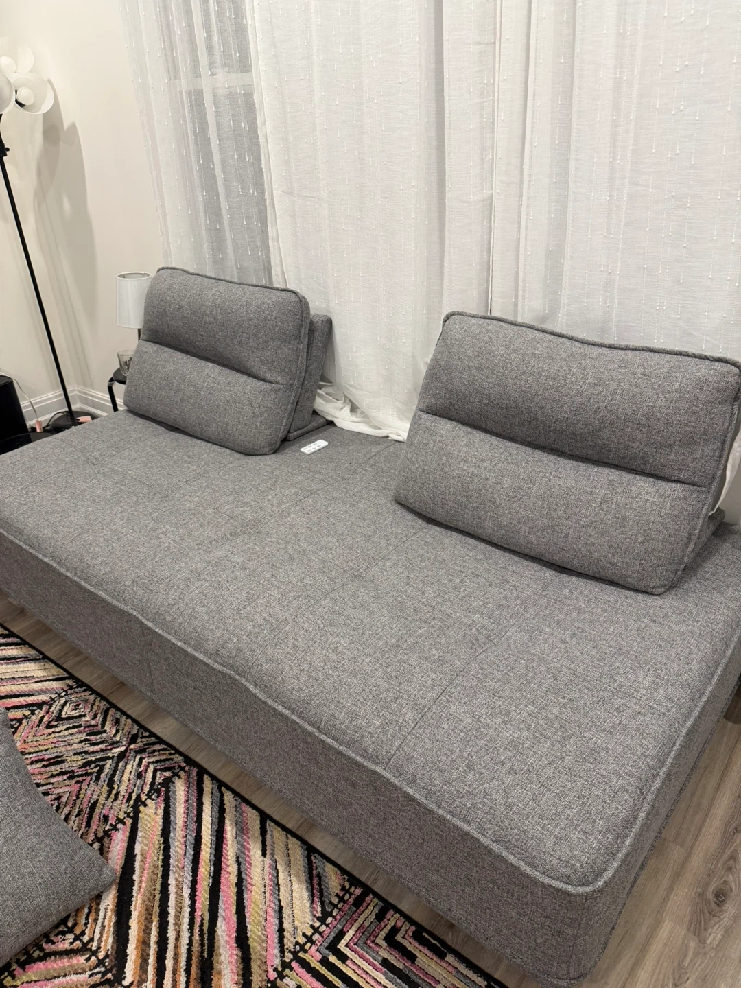 Grey upholstered daybed with two adjustable back pillows. It's made with durable fabric and has a clean, modern design. This piece works great as a sofa or a guest bed!