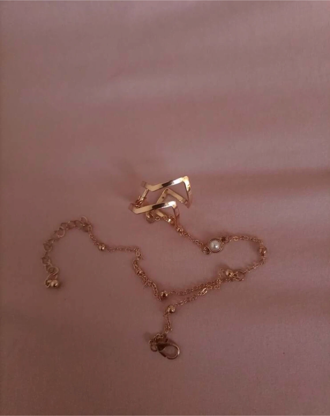 This hand bracelet is gold-toned and features a linked ring and bracelet design. It's adorned with small beaded accents and a single pearl detail. The adjustable clasp ensures a comfortable fit.