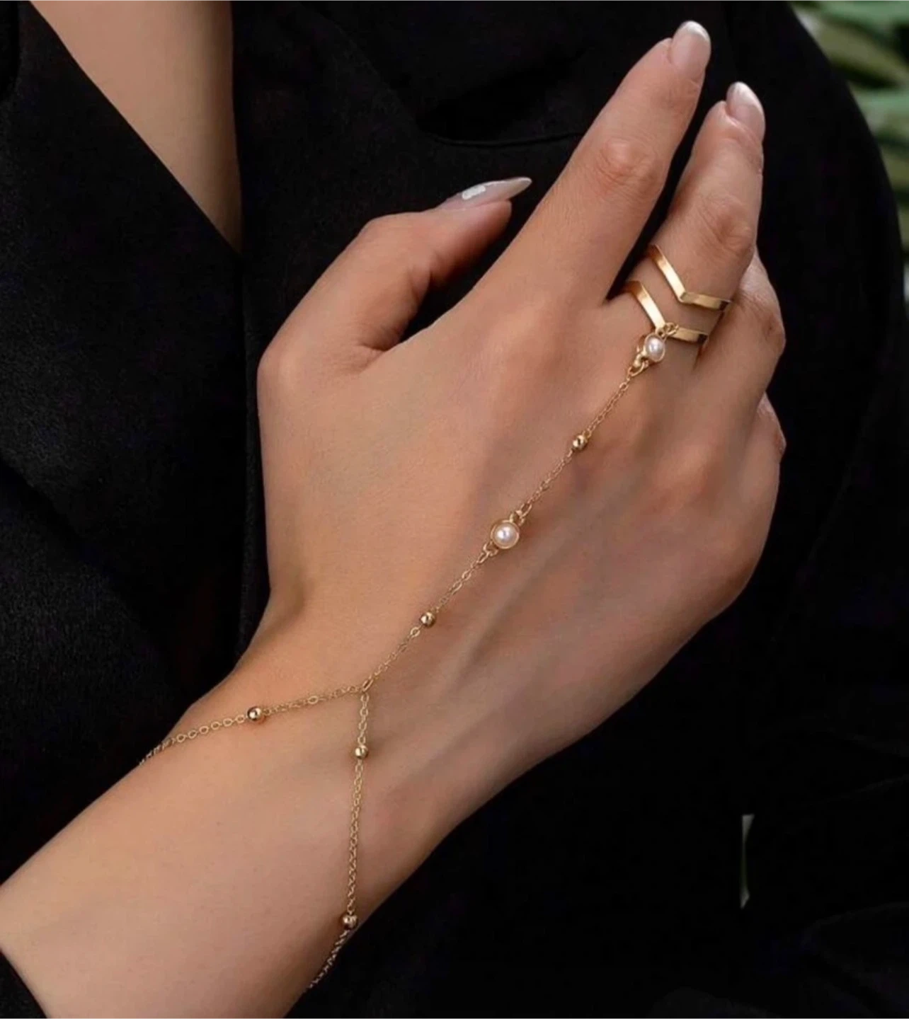 This hand bracelet is gold-toned and features a linked ring and bracelet design. It's adorned with small beaded accents and a single pearl detail. The adjustable clasp ensures a comfortable fit.