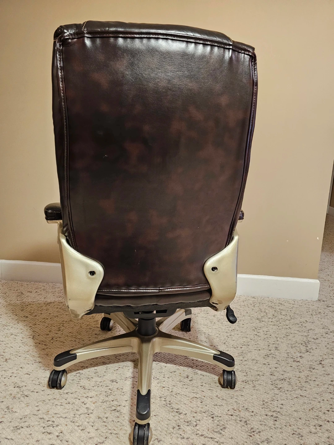 This office chair is upholstered in dark brown leather with contrasting stitching. It features a padded seat and backrest for comfort. The chair has a five-star base with wheels for easy mobility. Brought from Costco 3 years ago. It is in good condition with normal usage signs.