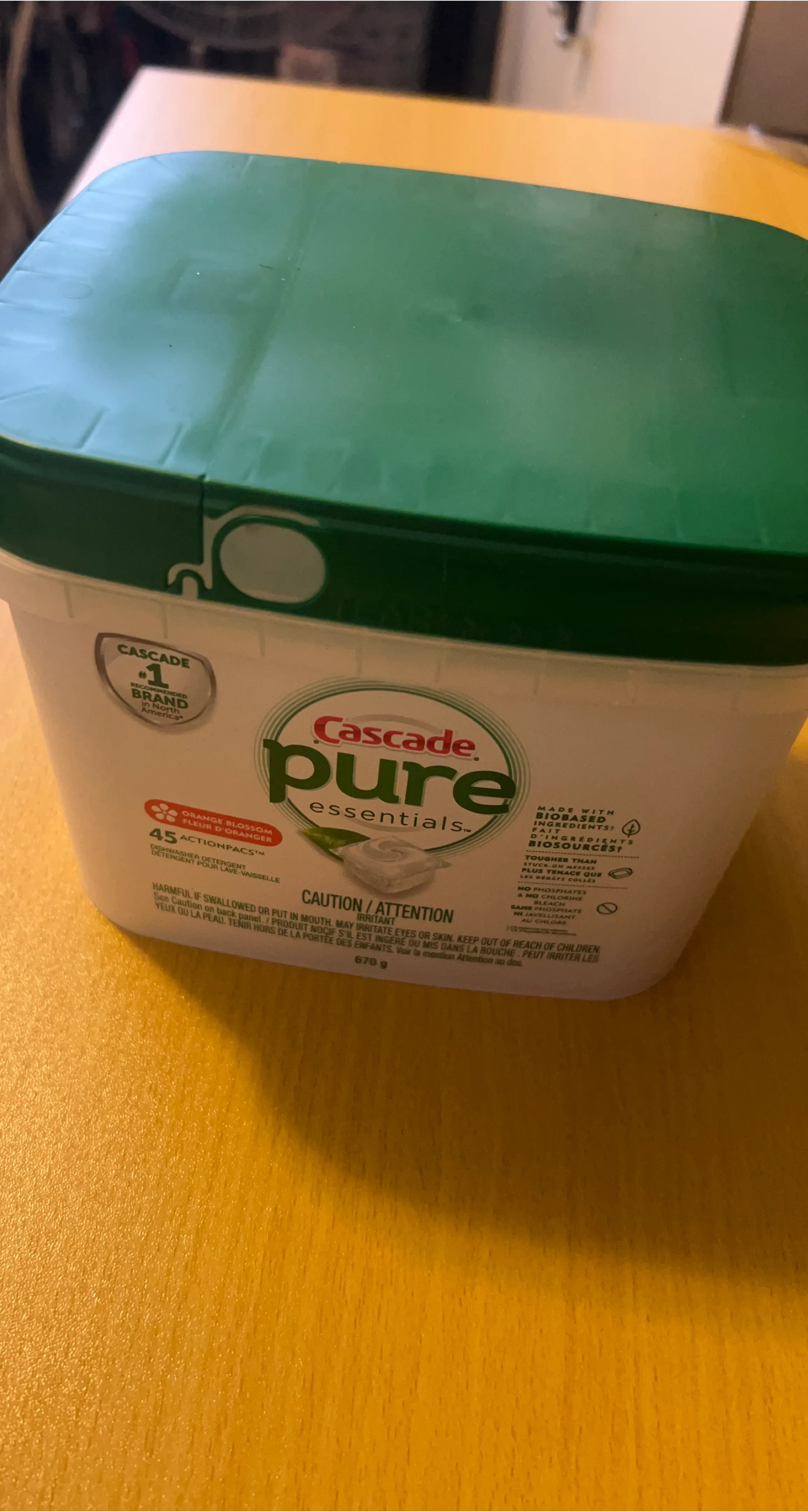 Cascade Pure Essentials dishwasher detergent in Orange Blossom scent. It's made with bio-based ingredients and contains 45 Actionpacs. The container holds 670g of product.