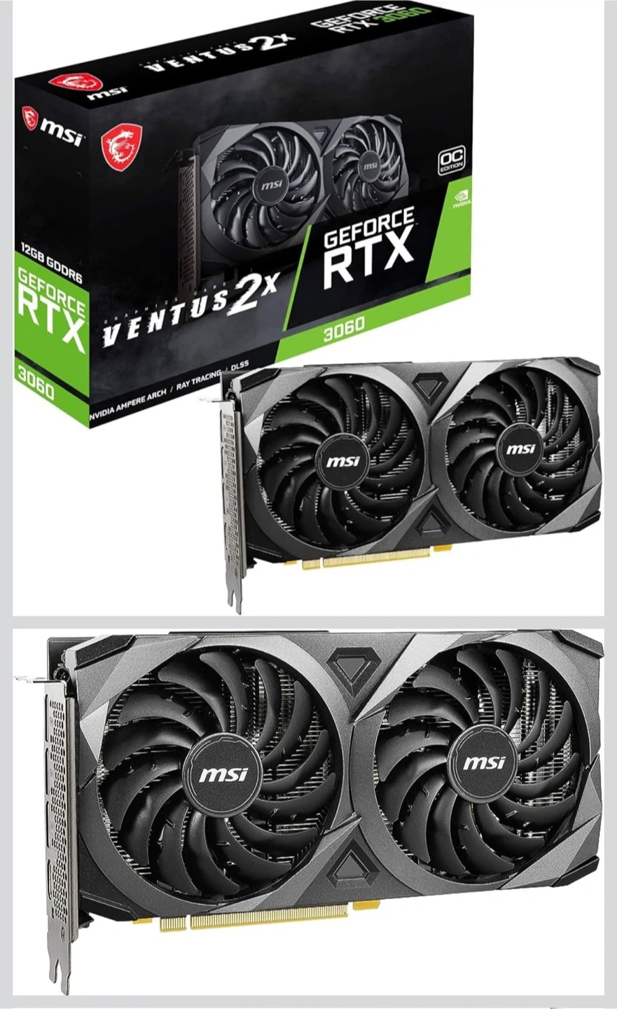 This is an MSI GeForce RTX 3060 Ventus 2X graphics card. It comes with 12GB of GDDR6 memory and supports NVIDIA Ampere Arch, Ray Tracing, and DLSS technologies. This OC Edition card offers enhanced performance for gaming and creative tasks.