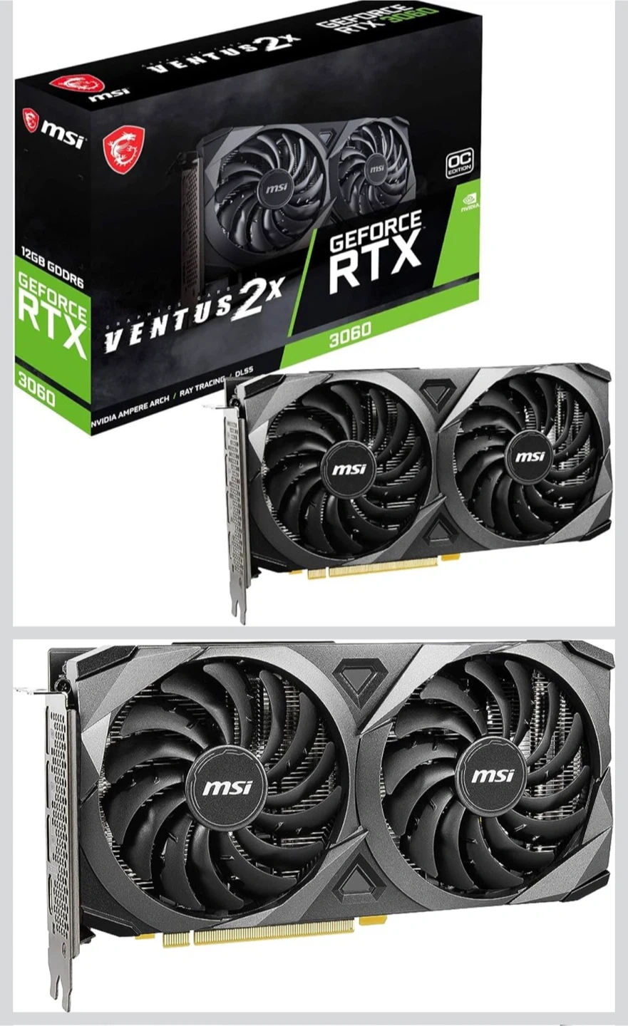 This is an MSI GeForce RTX 3060 Ventus 2X graphics card. It comes with 12GB of GDDR6 memory and supports NVIDIA Ampere Arch, Ray Tracing, and DLSS technologies. This OC Edition card offers enhanced performance for gaming and creative tasks.