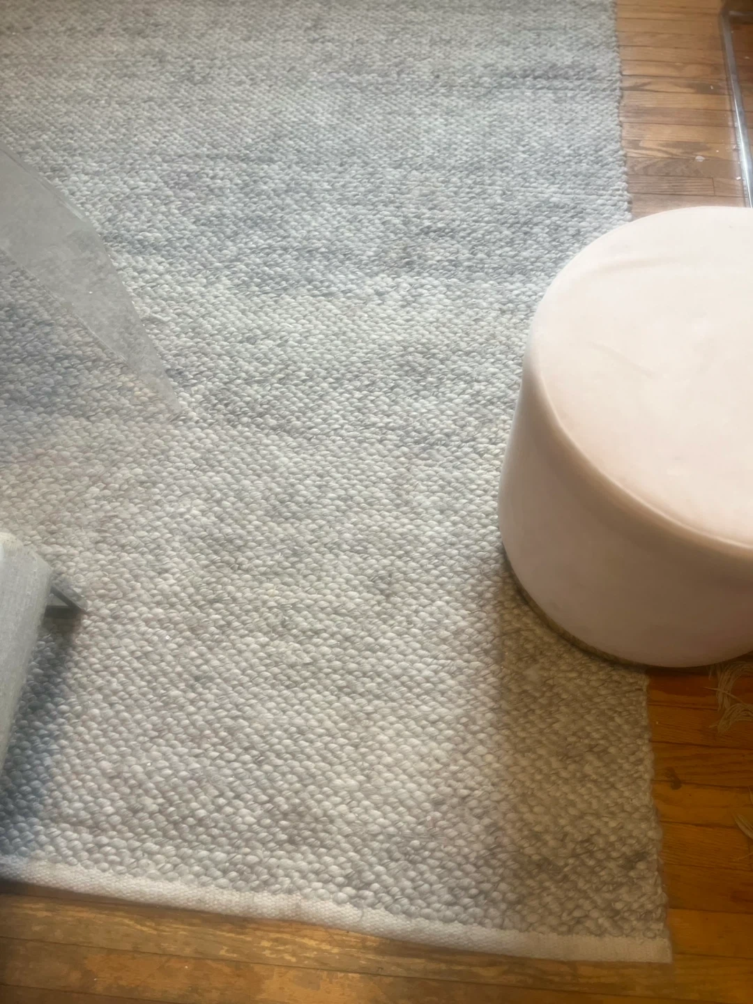 A soft, light grey area rug with a textured weave. It's a neutral colour that'll go with most decor. Provides a cozy feel underfoot. Soft & light tones.