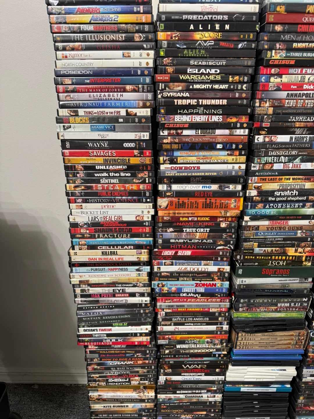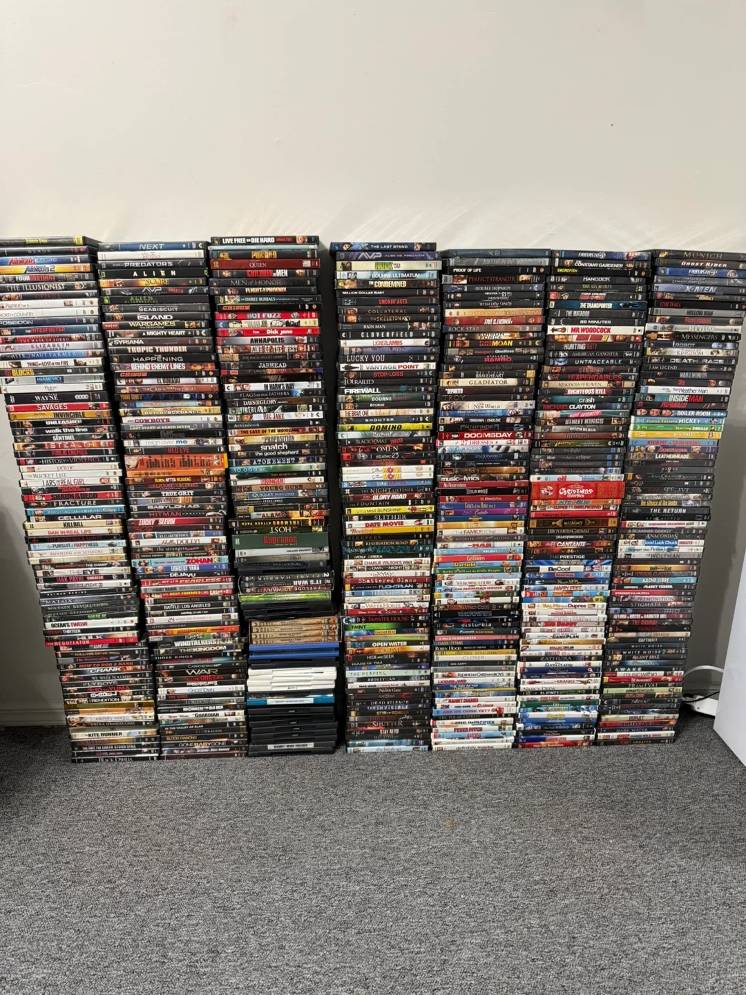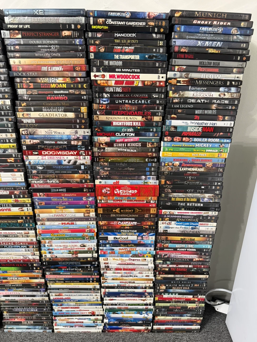 Large collection of assorted DVD movies. Titles vary widely across genres. 500 of them give or take. Only selling the lot. I need them gone. Open to offers within reason.
