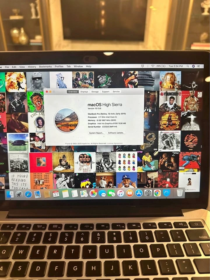 MacBook Pro running the macOS High Sierra operating system. Model: MacBook Pro (Retina, 13-inch, Early 2015). Operating System: macOS High Sierra, Version 10.13.6. Processor: 2.7 GHz Intel Core i5. Memory: 8 GB 1867 MHz DDR3. Graphics: Intel Iris Graphics 6100 1536 MB.