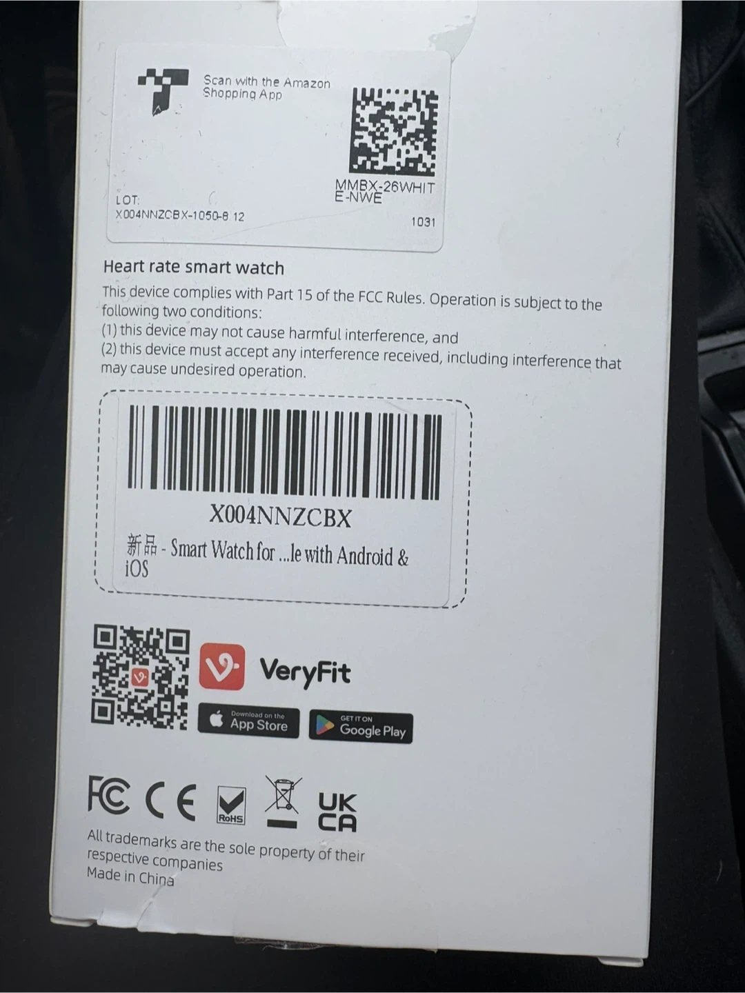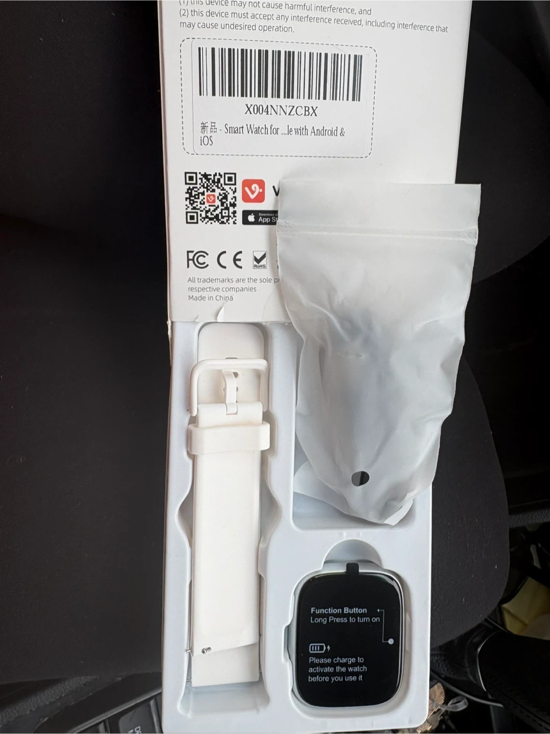 This is a heart rate smart watch that works with Android and iOS. It includes a white strap and comes in its original packaging. Please charge to activate the watch before you use it. Never used new in box.
