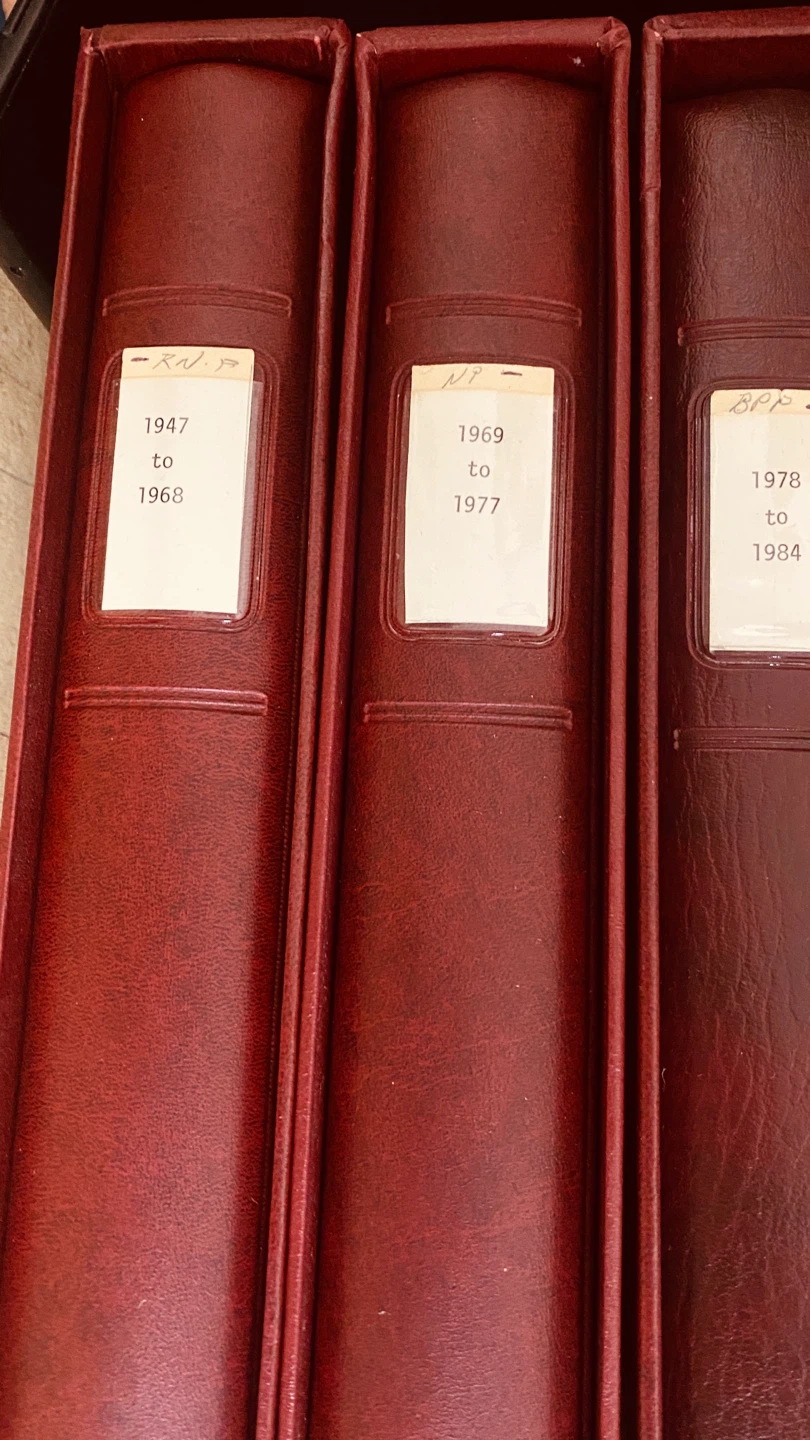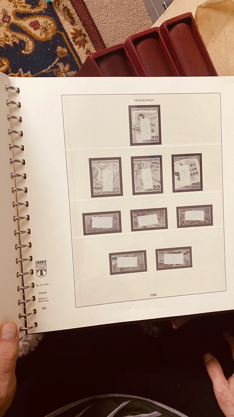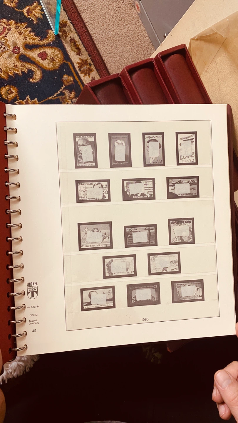 Collection of Lindner stamp albums and binders. Includes volumes covering years 1947-1968, 1969-1977, 1978-1984, and 1985-1988. These are great for organizing and preserving your stamp collection.