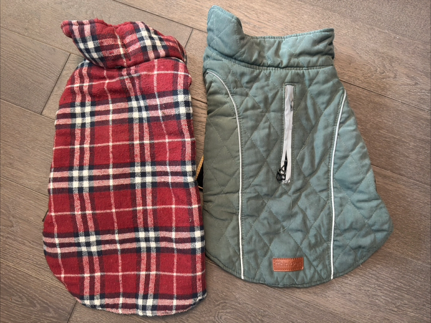 Two dog coats included: one cozy plaid and one quilted green winter jacket with a zippered pocket. The green jacket measures approximately 16 inches in length. Both are great for keeping your furry friend warm during colder weather!