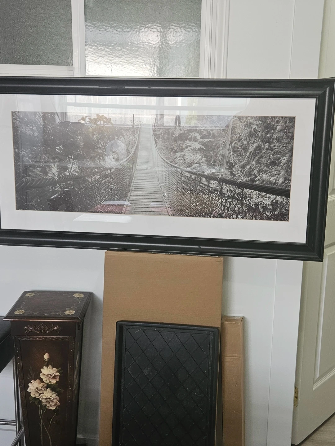 Beautiful panoramic framed artwork featuring a suspension bridge. The piece is housed in a black frame and measures approximately 36 inches wide by 12 inches tall. It's a striking landscape to enhance any room's decor.