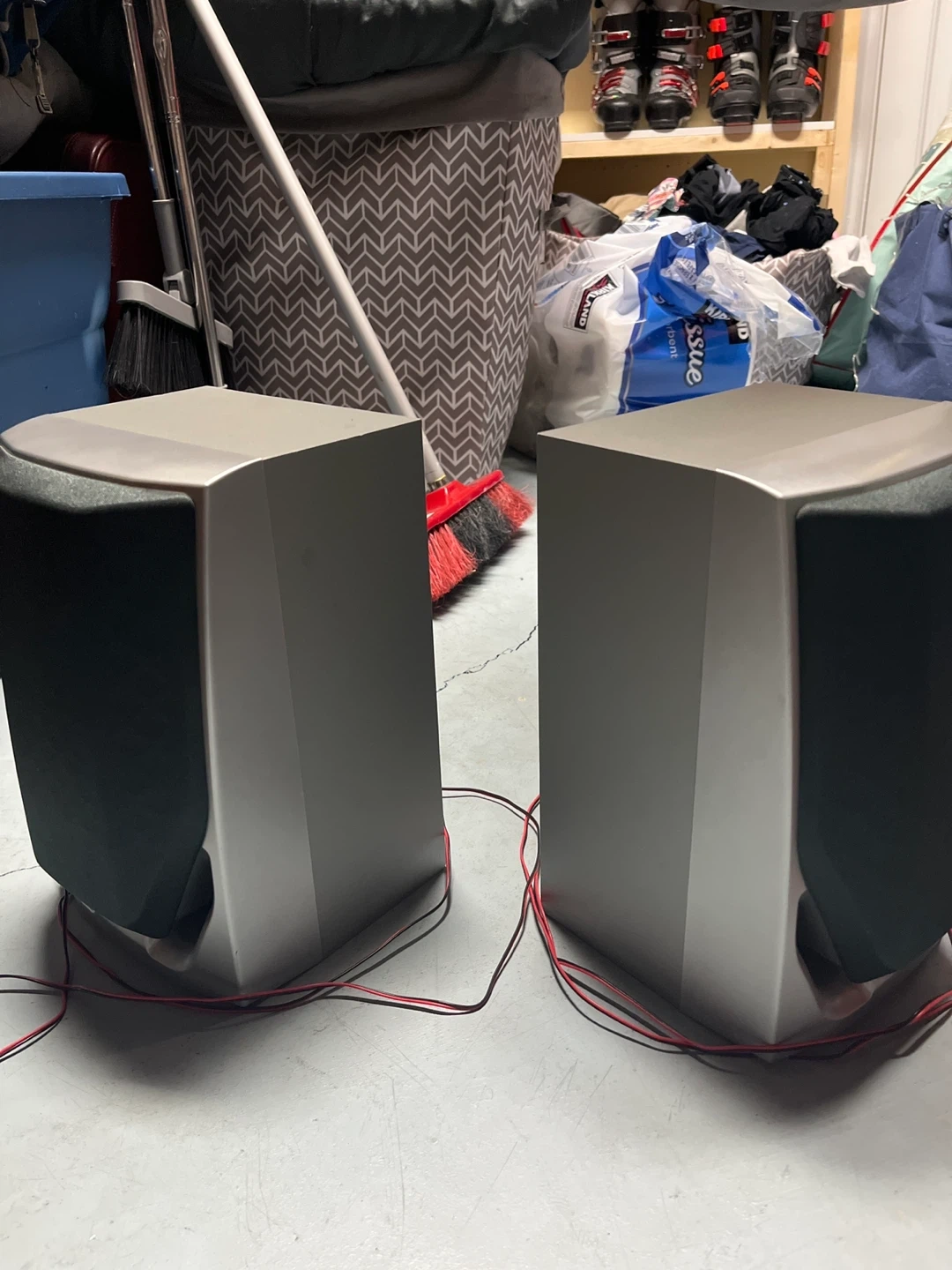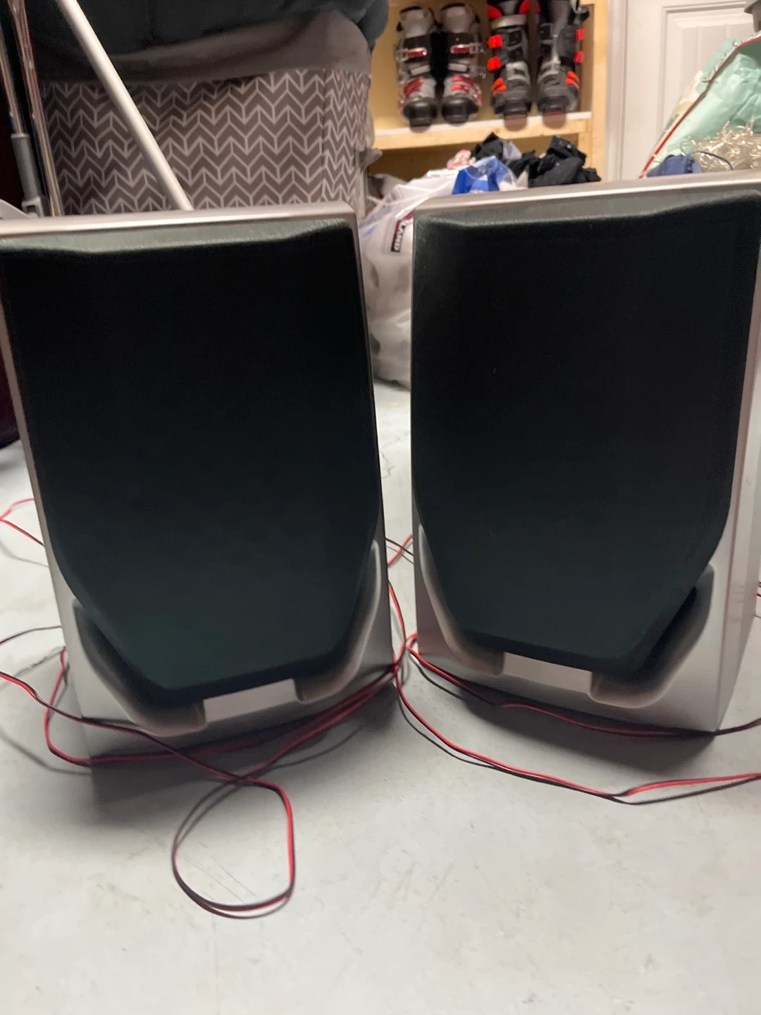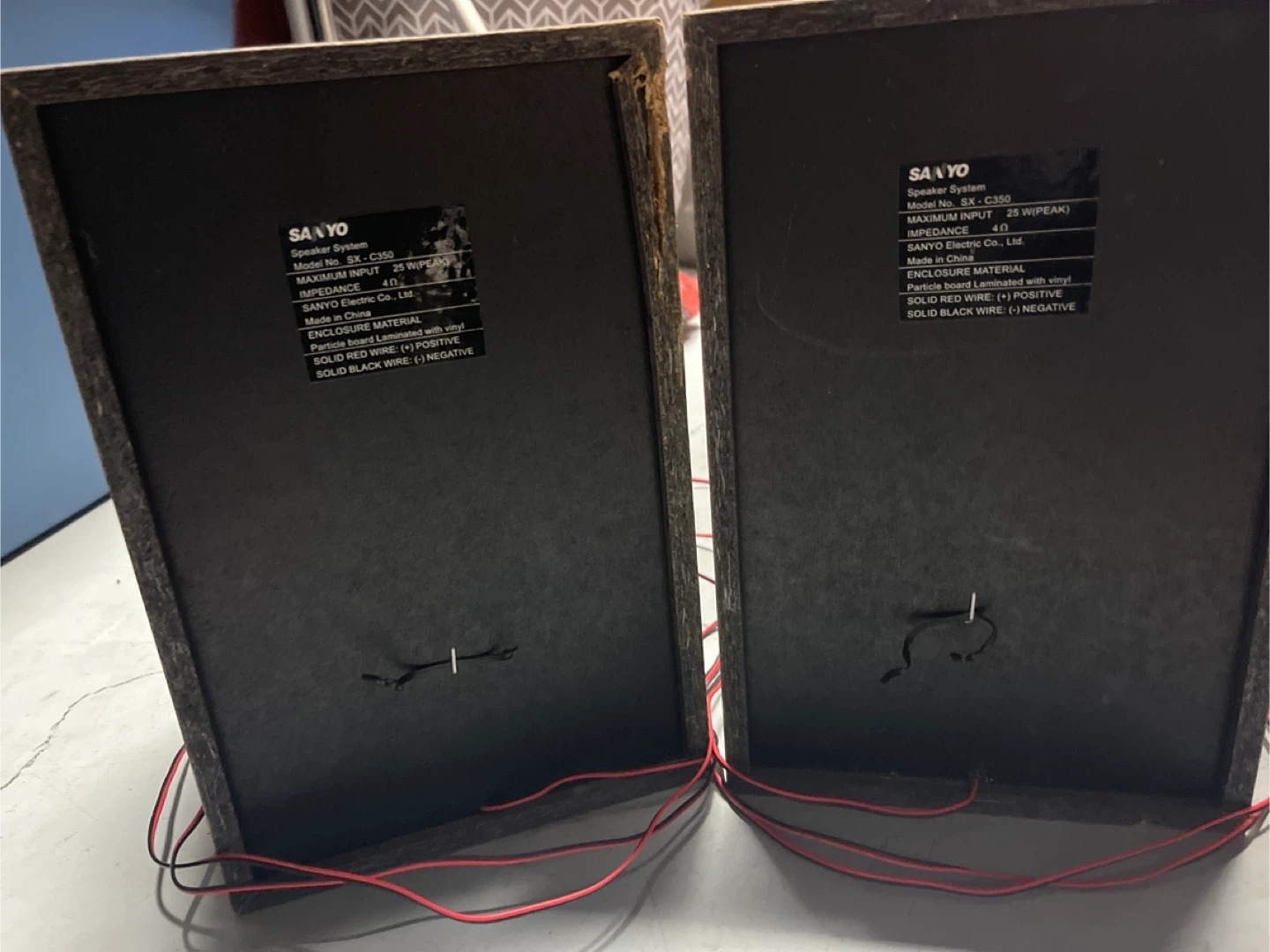 These are Sanyo SX-C350 bookshelf speakers. They're made with a particle board enclosure laminated with vinyl. Maximum input is 25 W (peak) with an impedance of 4 ohms. Solid red wire is positive, and solid black wire is negative. They'll add sound to any room!