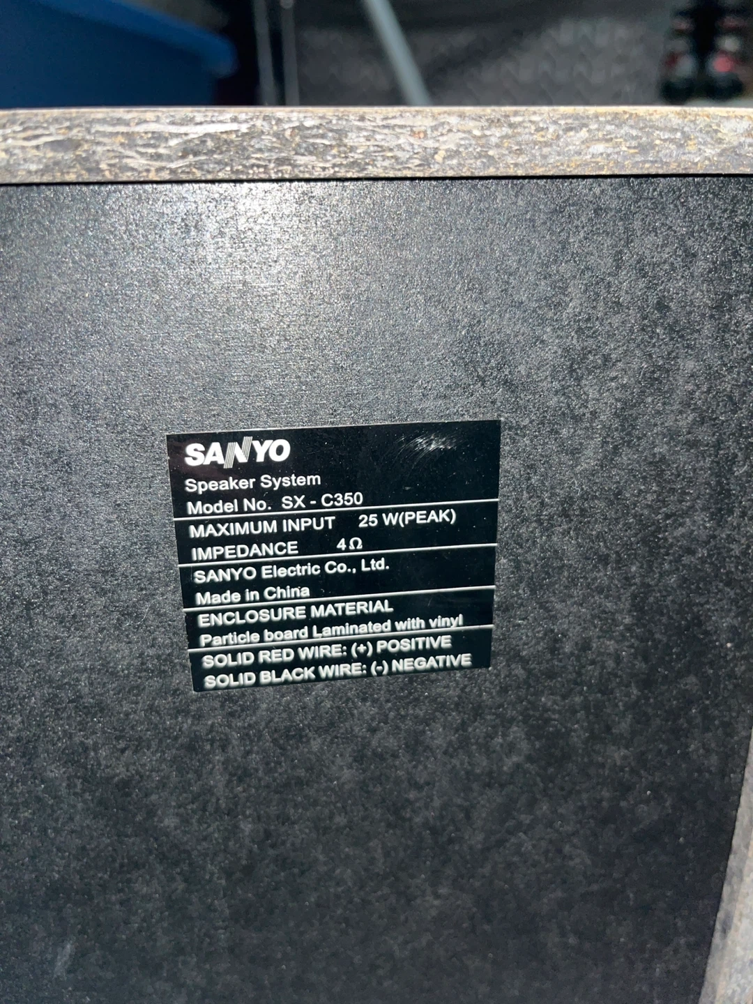 These are Sanyo SX-C350 bookshelf speakers. They're made with a particle board enclosure laminated with vinyl. Maximum input is 25 W (peak) with an impedance of 4 ohms. Solid red wire is positive, and solid black wire is negative. They'll add sound to any room!