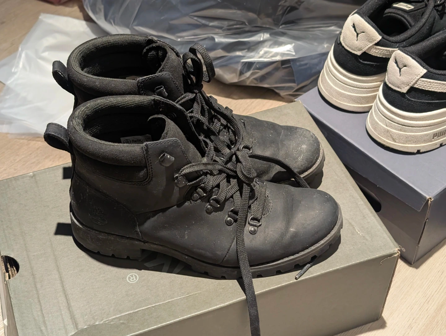 These are Timberland black lace-up hiking boots. They're made of leather. Perfect for outdoor adventures!