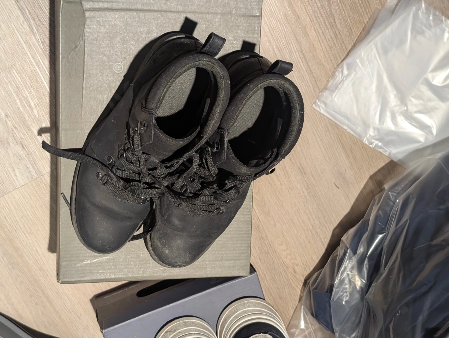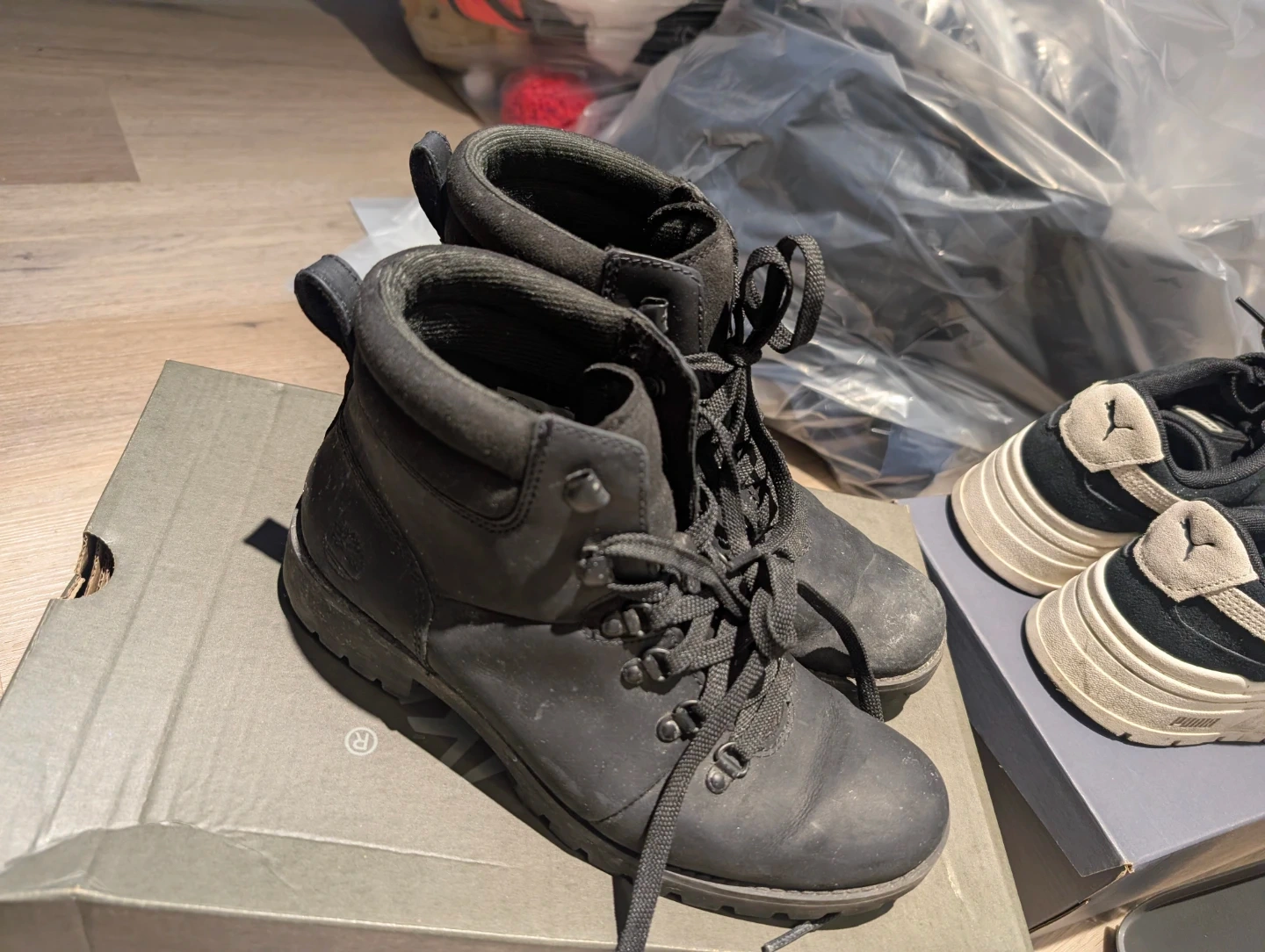 These are Timberland black lace-up hiking boots. They're made of leather. Perfect for outdoor adventures!