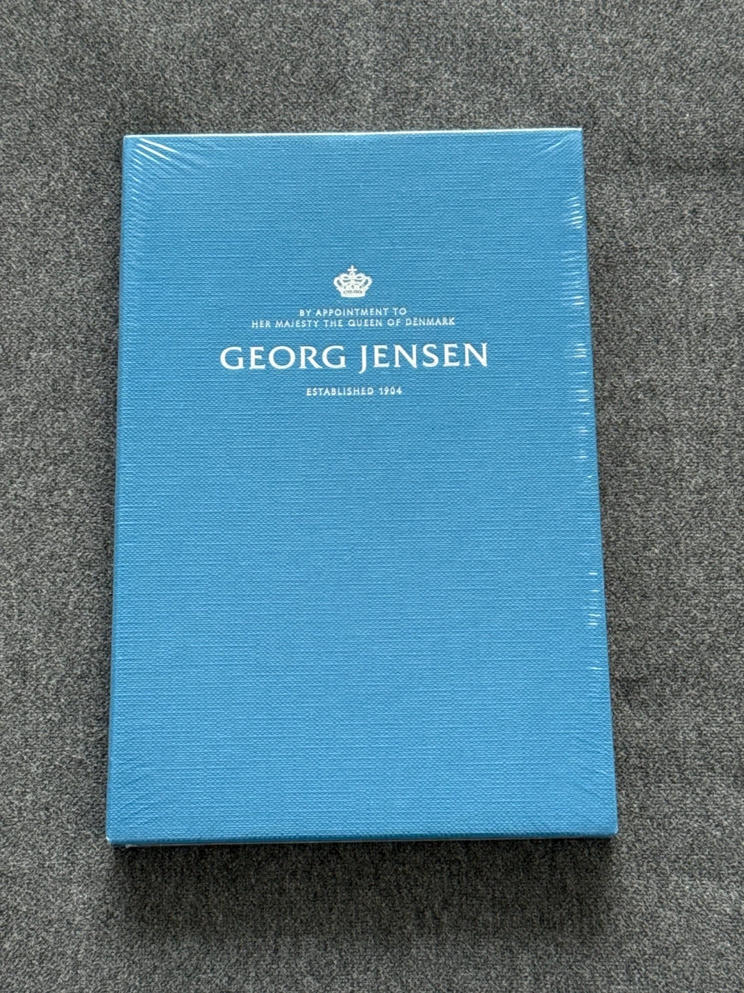 This is a Georg Jensen notebook. It's brand new and still in its original plastic wrapping. The cover is a textured blue, and it's sealed.