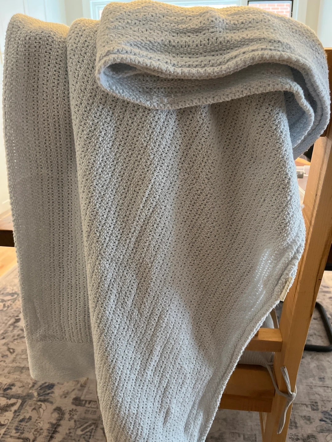 A soft, light blue knit throw blanket with a textured pattern. It's perfect for adding a cozy layer to your couch or bed. Measures approximately 72 x 90”