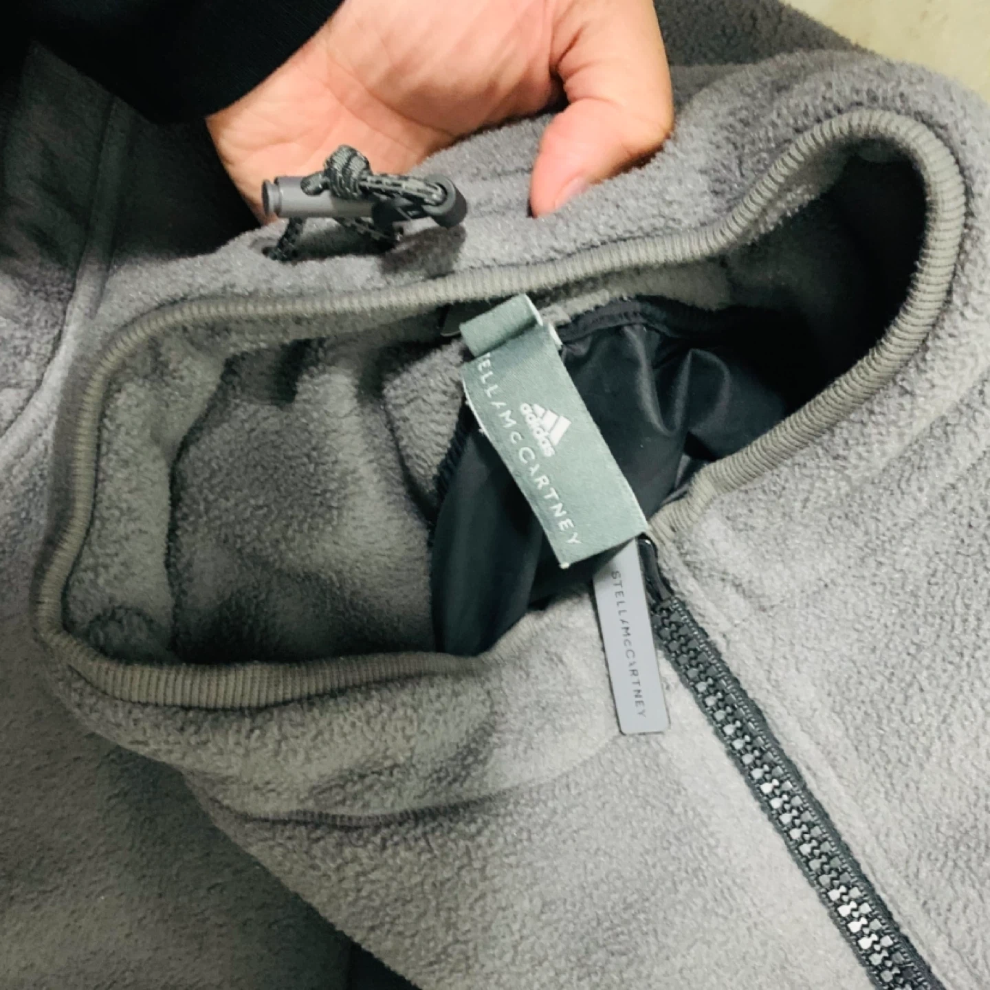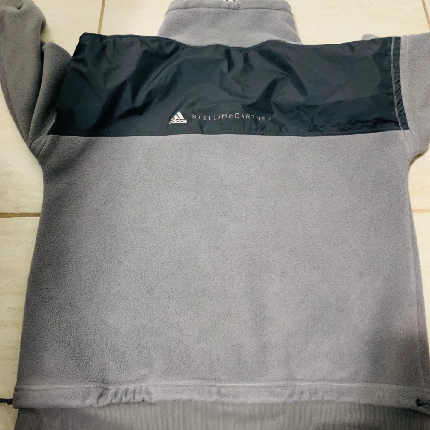 This is a grey fleece pullover from Adidas by Stella McCartney. It features a quarter-zip neck and contrasting black nylon pocket panels. It's made for comfort and athletic wear.