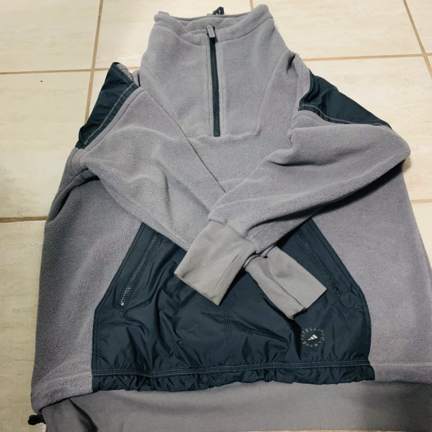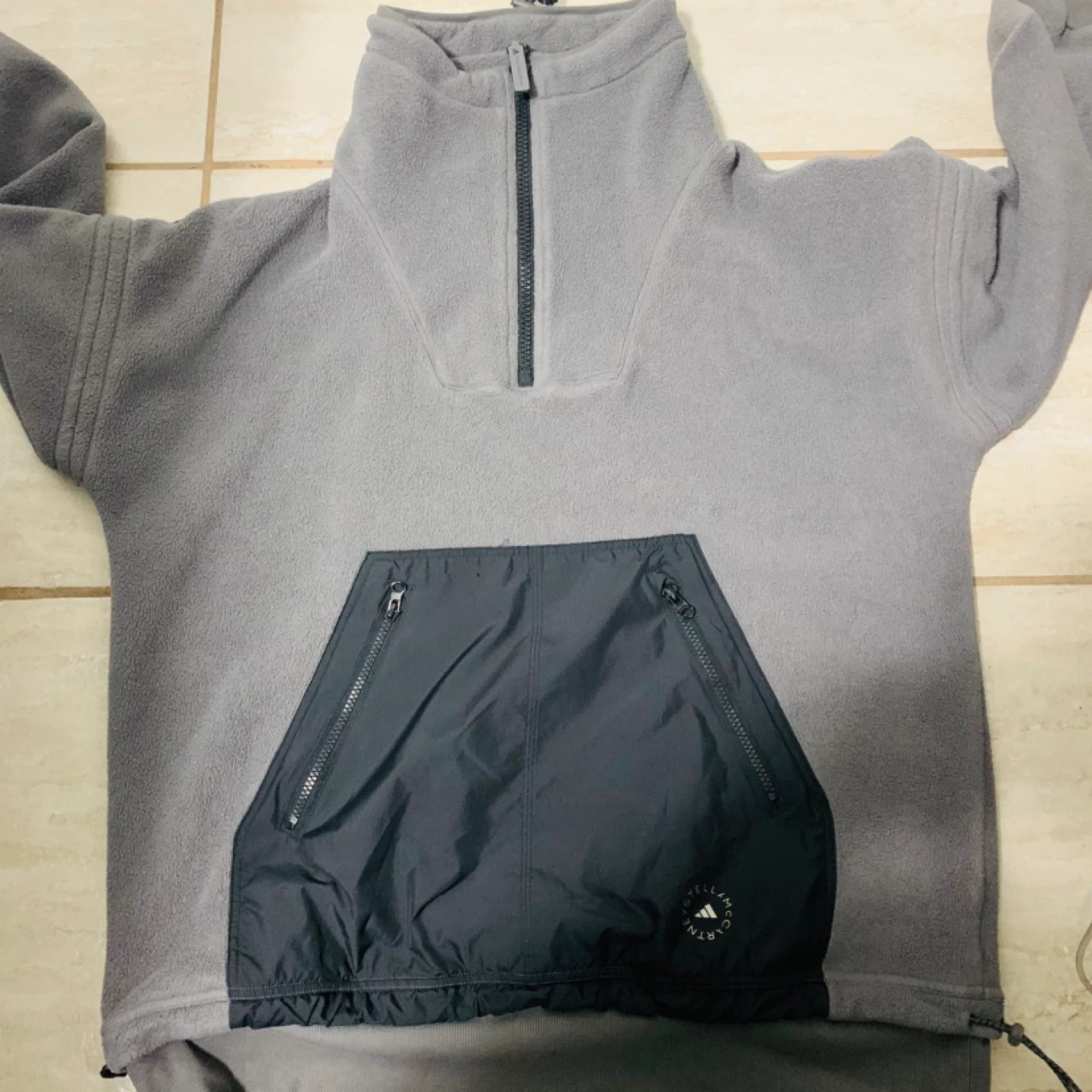 This is a grey fleece pullover from Adidas by Stella McCartney. It features a quarter-zip neck and contrasting black nylon pocket panels. It's made for comfort and athletic wear.