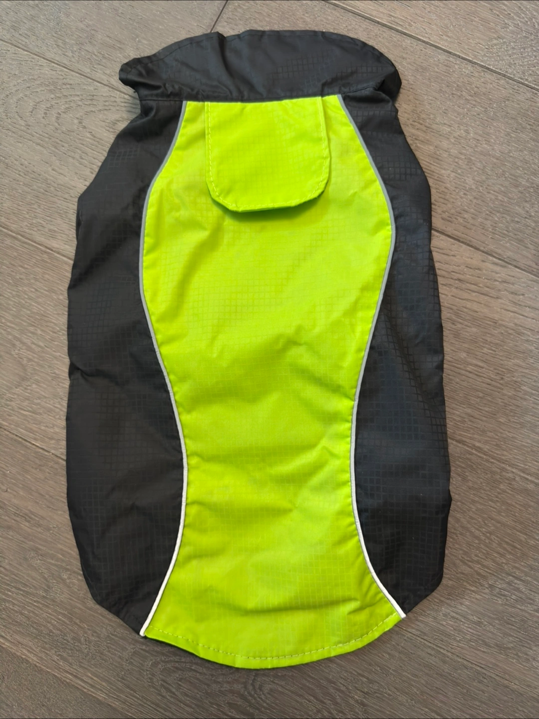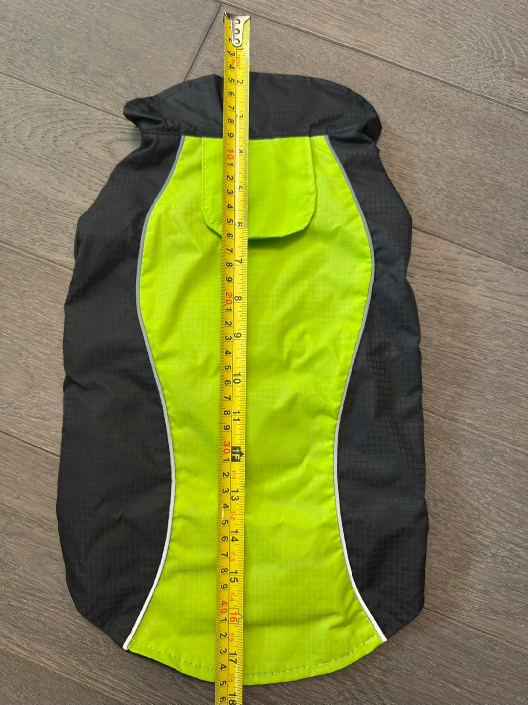 This is a warm winter coat for dogs. It's black and neon green with reflective piping. Measures approximately 17 inches in length. Adjustable velcro closures for a snug fit. Perfect for keeping your furry friend cozy on chilly walks!