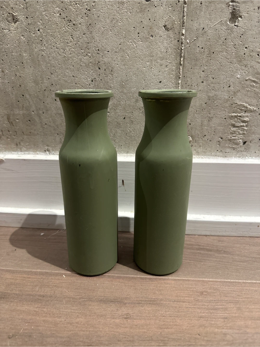A set of two olive green vases. They're a sturdy material and have a unique, minimalist design. Perfect for displaying small bouquets or as standalone decorative pieces.