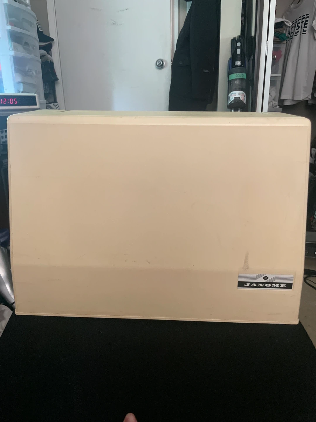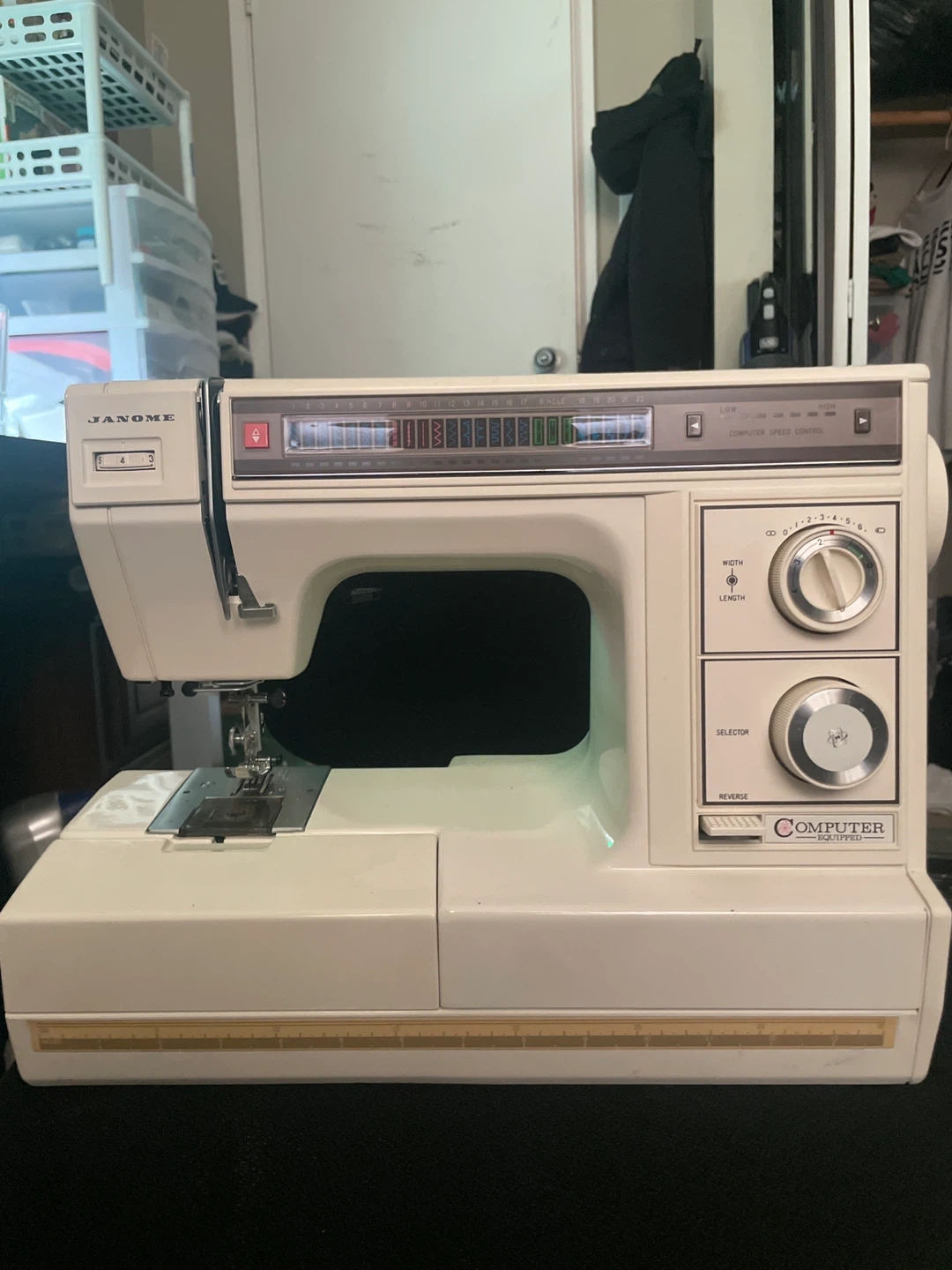 This is a Janome Computer SX-2122 sewing machine. It's a cream-coloured unit with various stitch settings. The power cord is included.