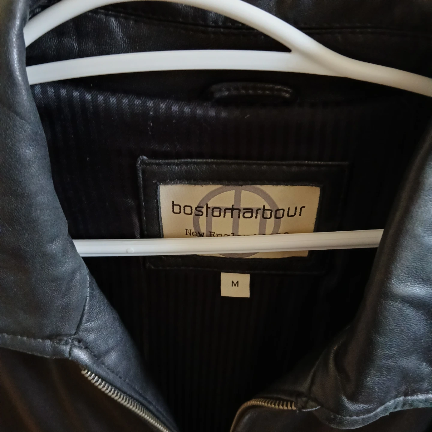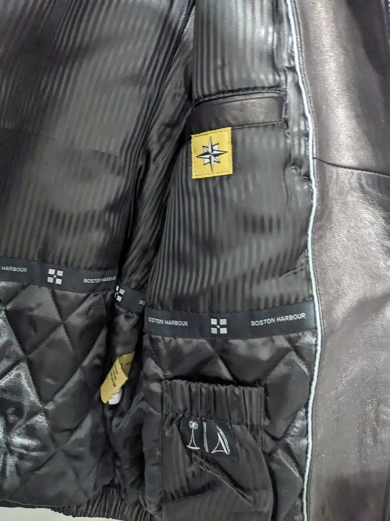 Boston Harbour genuine leather jacket. Outershell is genuine leather with a 100% polyester lining. Sleeve lining is also 100% polyester. This classic jacket is ready for a new owner!