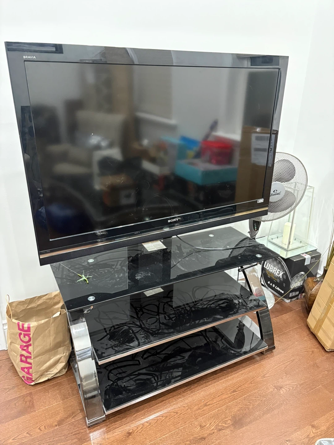 This is a black glass and chrome TV stand. It has three shelves for storage. It's a sturdy stand that can hold a television. Comes with the Sony TV.