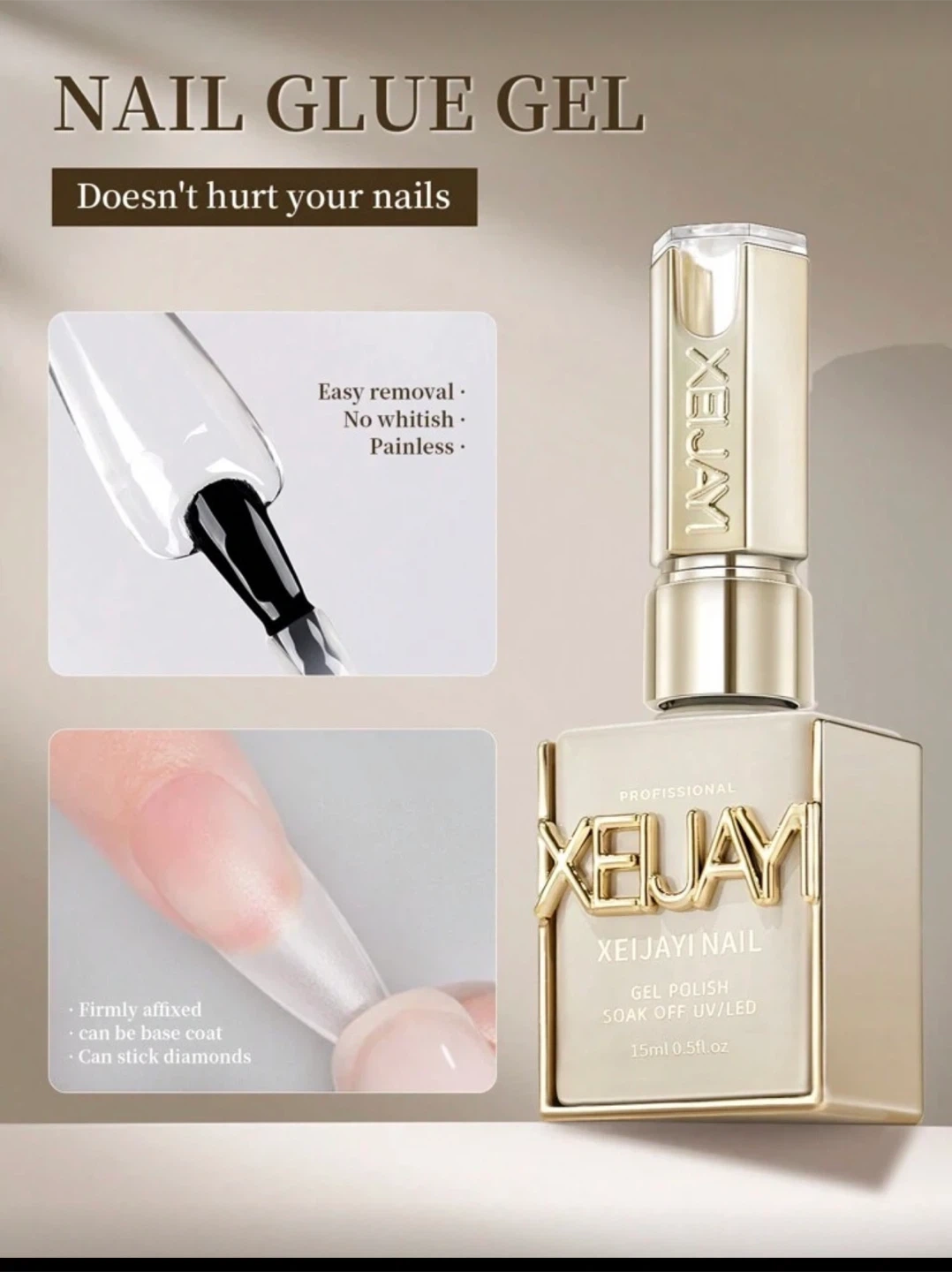 XEJIYAI Nail Gel Polish in a 15ml bottle. It's soak-off UV/LED gel that can be used as a base coat. This gel doesn't hurt your nails and can firmly affix diamonds.