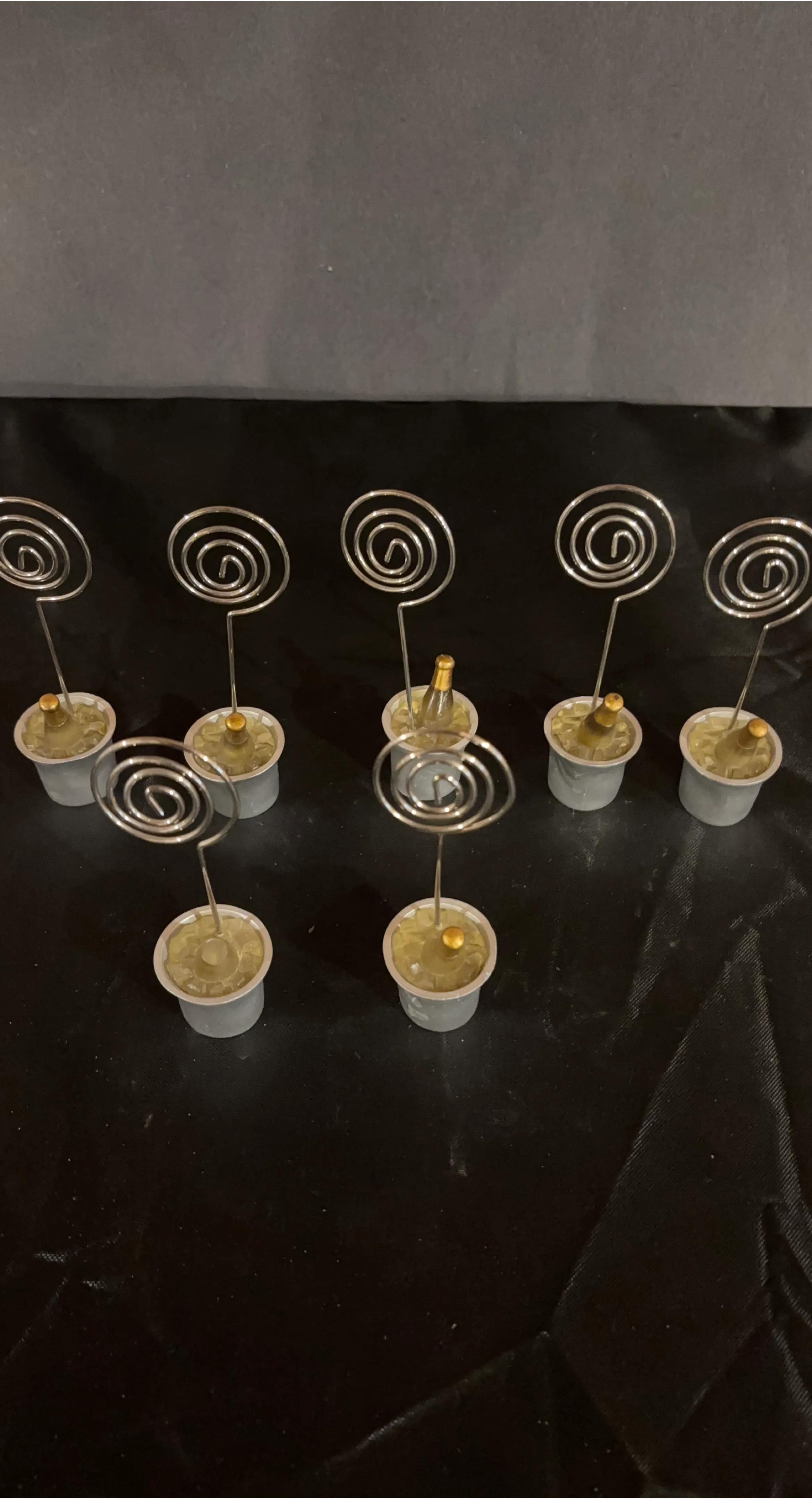 These are cute little holders for table numbers or photos. They have a silver spiral top with a weighted base that looks like a miniature champagne bucket. Perfect for weddings or special events! 4H
