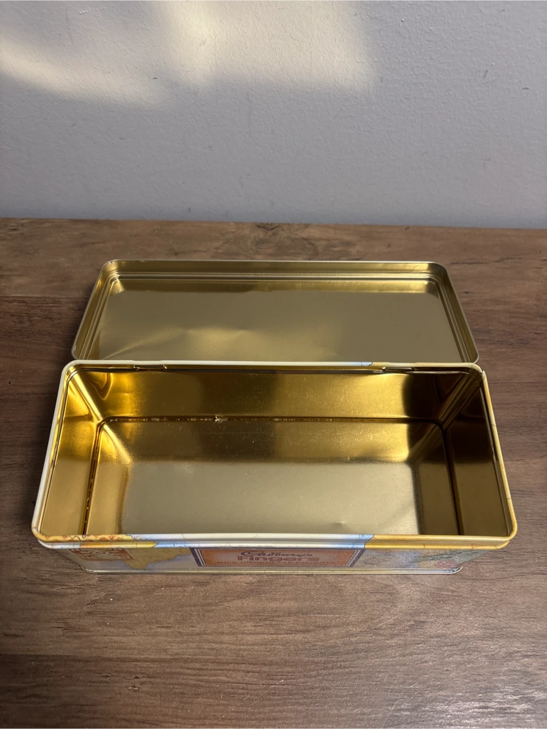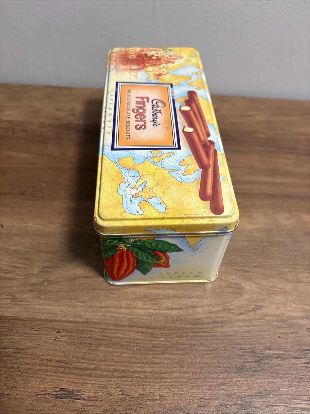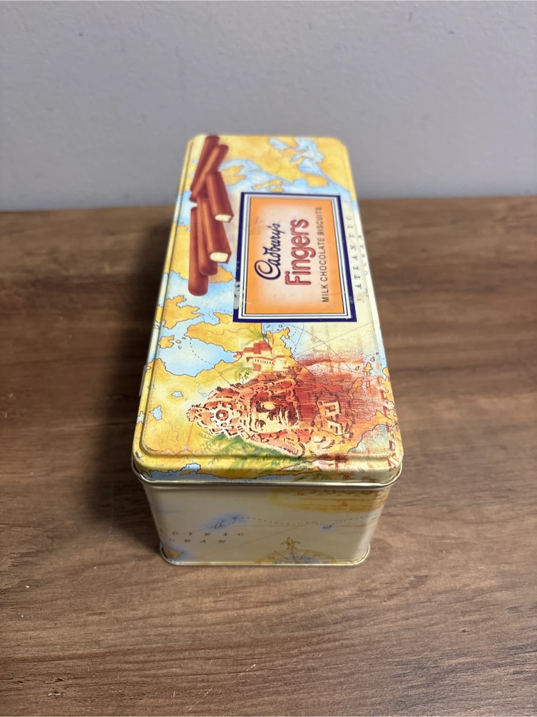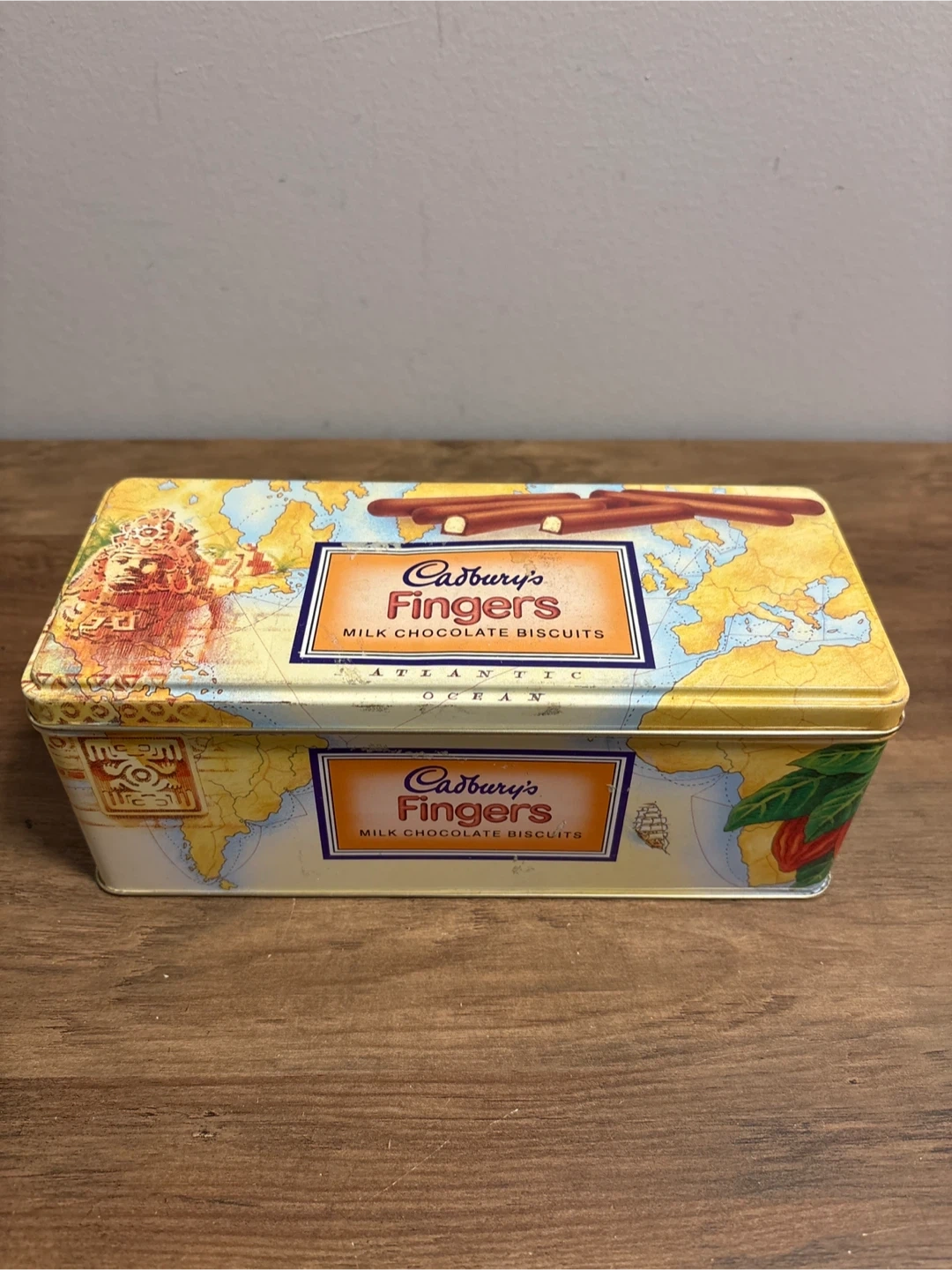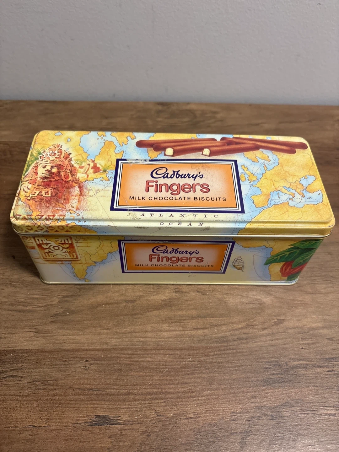 A collectible tin featuring Cadbury's Fingers milk chocolate biscuits. The tin has a map design with various historical illustrations. It's perfect for storing small items or as a decorative piece.