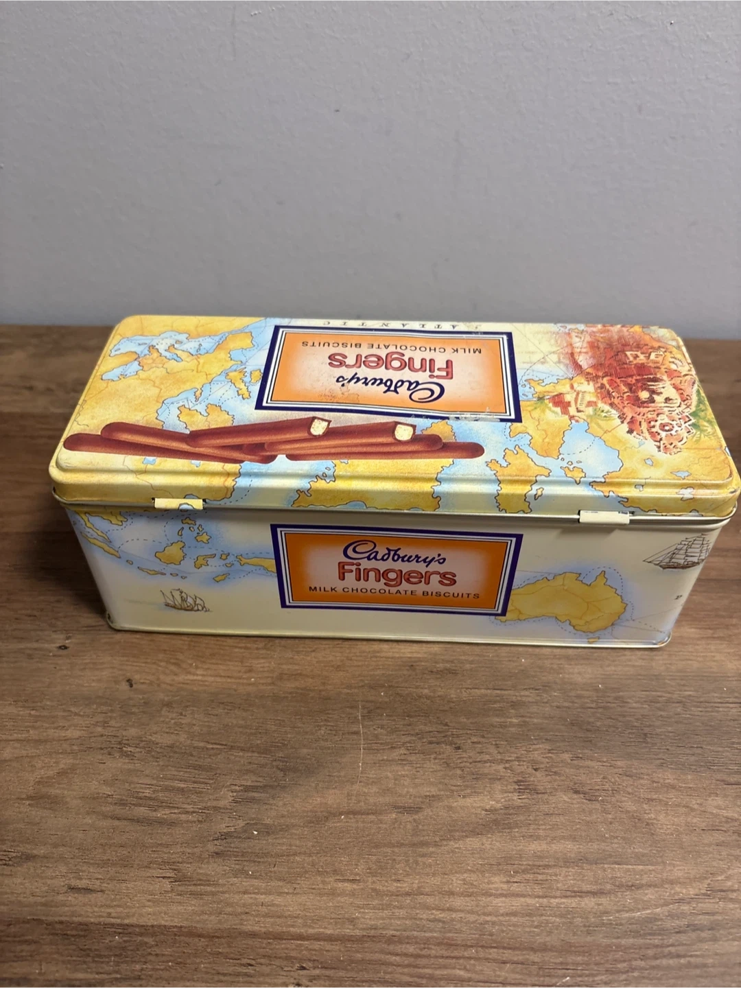 A collectible tin featuring Cadbury's Fingers milk chocolate biscuits. The tin has a map design with various historical illustrations. It's perfect for storing small items or as a decorative piece.