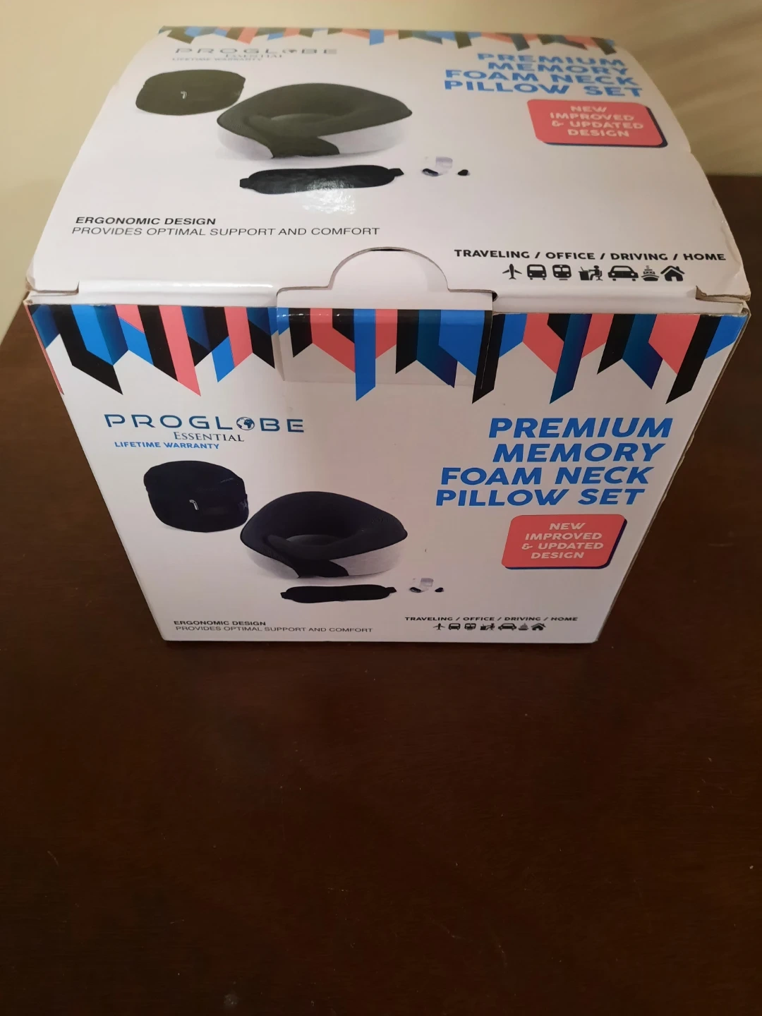 This is a Proglobe premium memory foam neck pillow set. It features an ergonomic design for optimal support and comfort. It's suitable for traveling, office, driving, and home use!
