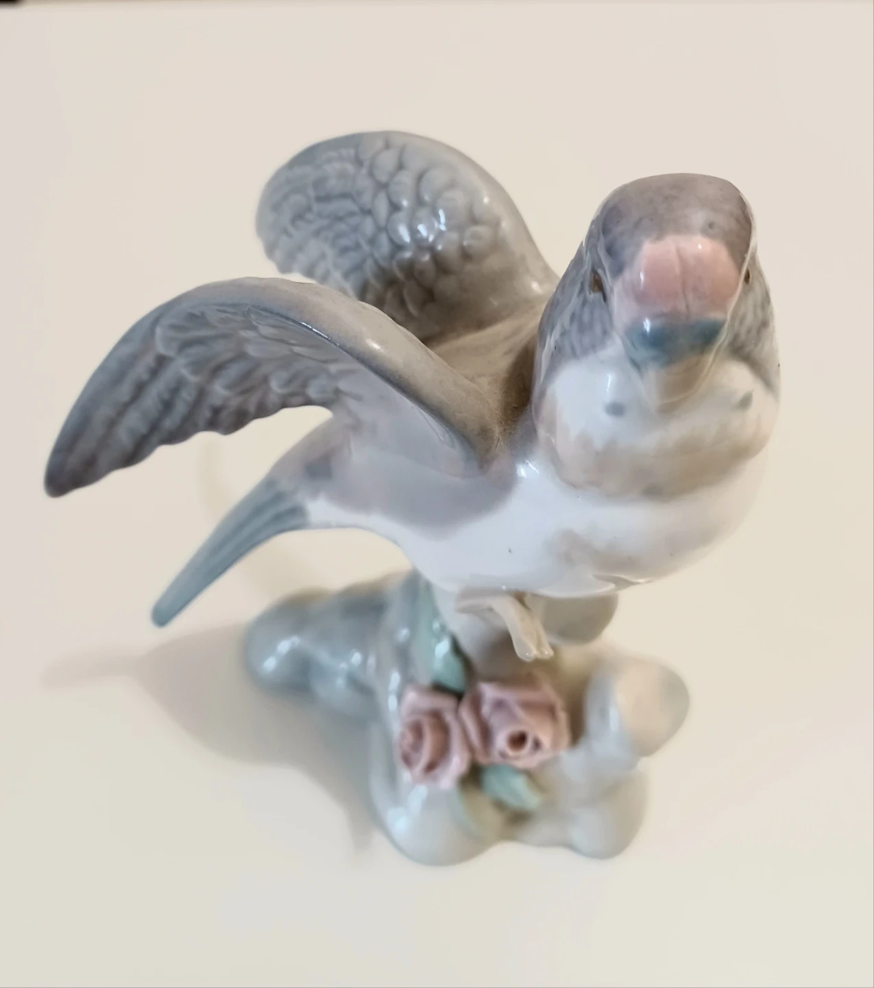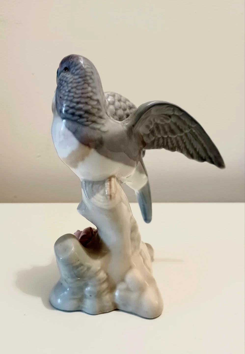 Miquel Requena Porcelanas Parakeet Figurine, crafted in Valencia, Spain, showcasing a beautiful grey and white plumage with delicate pink floral accents on its base. This piece brings a touch of Elegant Spanish artistry to any collection.