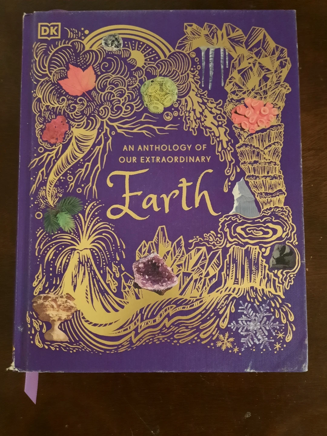 DK An Anthology of Our Extraordinary Earth book. It's a hardcover book with a purple cover featuring gold embossed illustrations. This book explores the wonders of our planet.