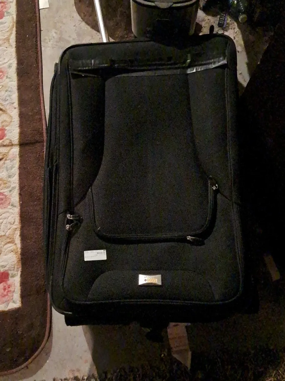 Delsey black rolling luggage with extendable handle. It's made of durable fabric material. Perfect for short trips and weekend getaways!